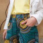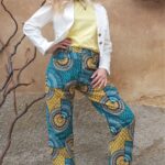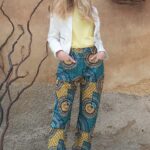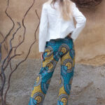 Dámské kalhoty ušité z křiklavé africké látky.