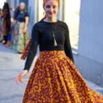Velmi bohatá, originální sukně z oranžové  látky s africkým designem.