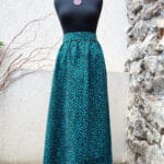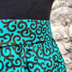 Dlouhá sukně ušitá z africké látky pestré tyrkysové barvy.