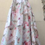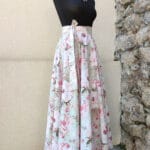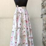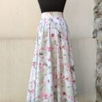 Zavinovací sukně kolového střihu ušitá z bavlněné látky s potiskem něžných květů na mentolovém podkladu.