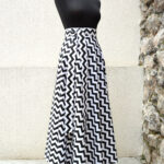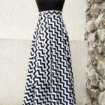 Výrazná, zavinovací sukně půlkolového střihu.
