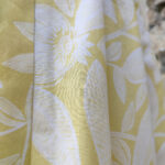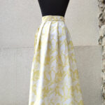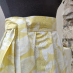 Zavinovací sukně ušitá z velmi pěkné látky. Kvalitní bavlna v jemně žlutém odstínu s tiskem bílých květů.
