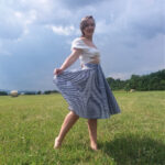 Zavinovací sukně kolového střihu, 100% bavlna s jemným, modrým proužkem.