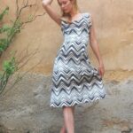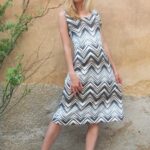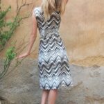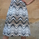 Elegantní střih s kulatým výstřihem, výrazný chevron v hnědých a černých barvách na bílém podkladu, bez rukávů.