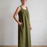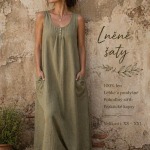 Lněné dlouhé šaty bez rukávů,určené na teplé dny,z prodyšného přírodního lnu. Mají boční skryté kapsy,efektní sámky okolo výstřihu s knoflíčky.Lemy jsou z odlišné látky.Volně splývavé, mírně rozšířené.Ve velikostech 38,40,42,44.Na přání ušijeme podle vašich požadavků. v barvách khaki,přírodní,černé,rezavé.