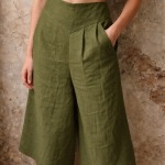 Letní třičtvrteční kalhoty ze lnu.Délka od pasu 75-80cm. Mají vyšší vaztužený pás na předním díle. Na zadním v pase gumu. Kapsy, podložení kapes a pásu je ve vzorované látce, odlišné. Máme v barvě khaki,světlé béžové,černé,rezavé velikosti 34,38,40,Na zakázku ušjeme kalhoty do mír které požadujete.