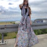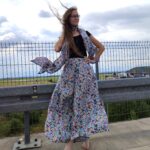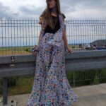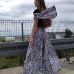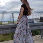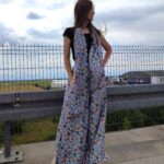 Zavinovací kalhoty ušité z jemné látky, světle modrý odstín s tiskem něžných kvítků.