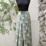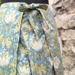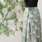 Dámské zavinovací kalhoty ušité z jemné bavlny, modrý podklad s olivovými lístky.