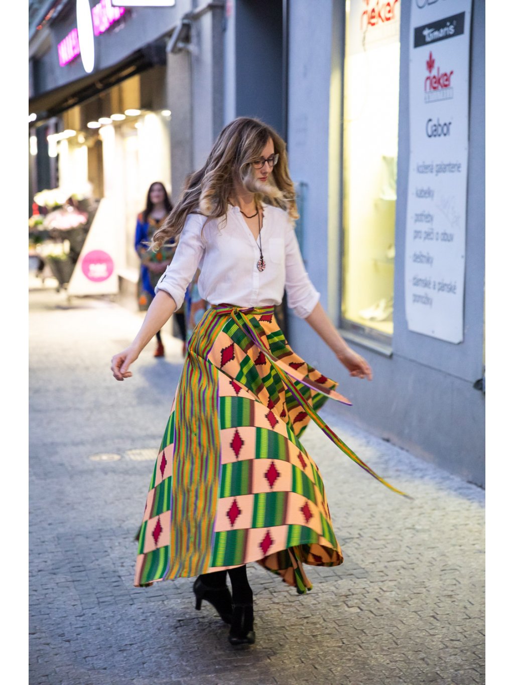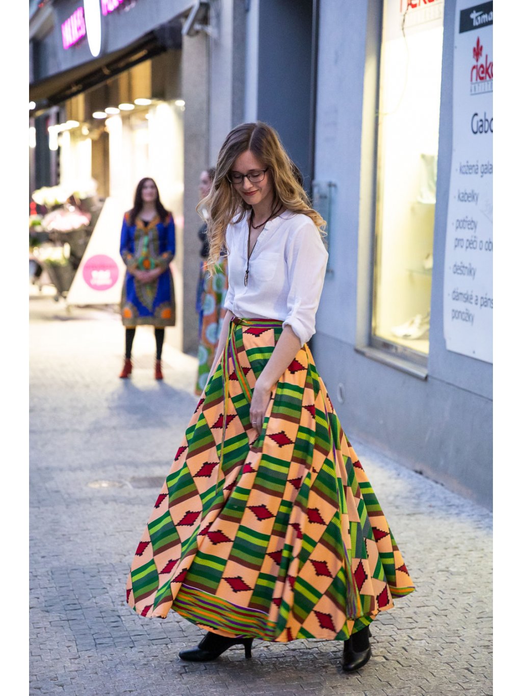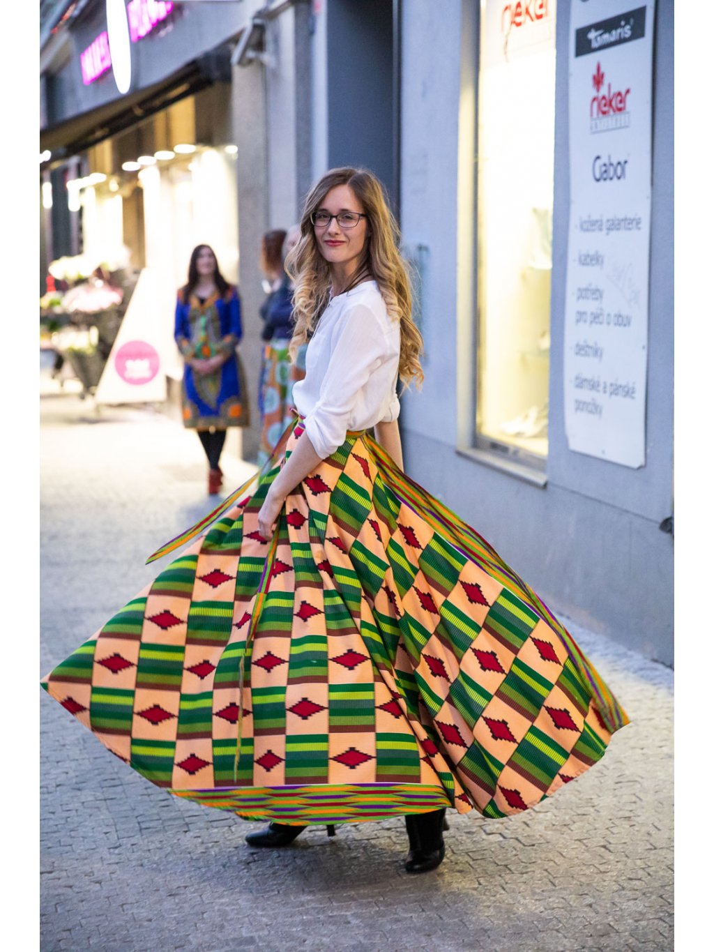 Dlouhá, zavinovací sukně kolového střihu, ušitá z africké látky pestrých barev, vzor kente.