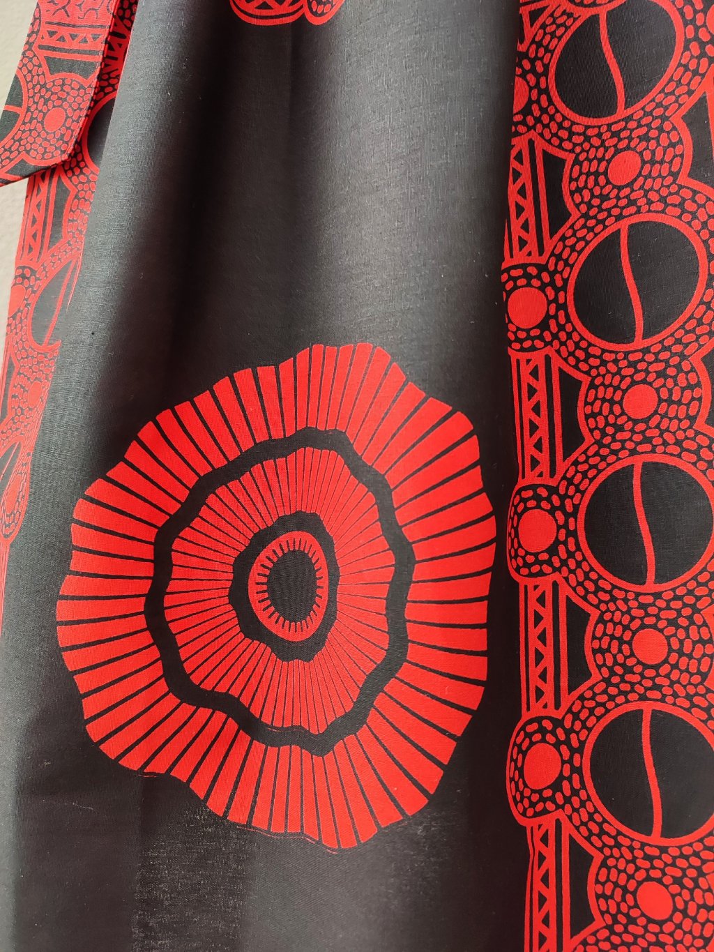 Dlouhá, zavinovací sukénka ušitá z africké látky jasných barev.