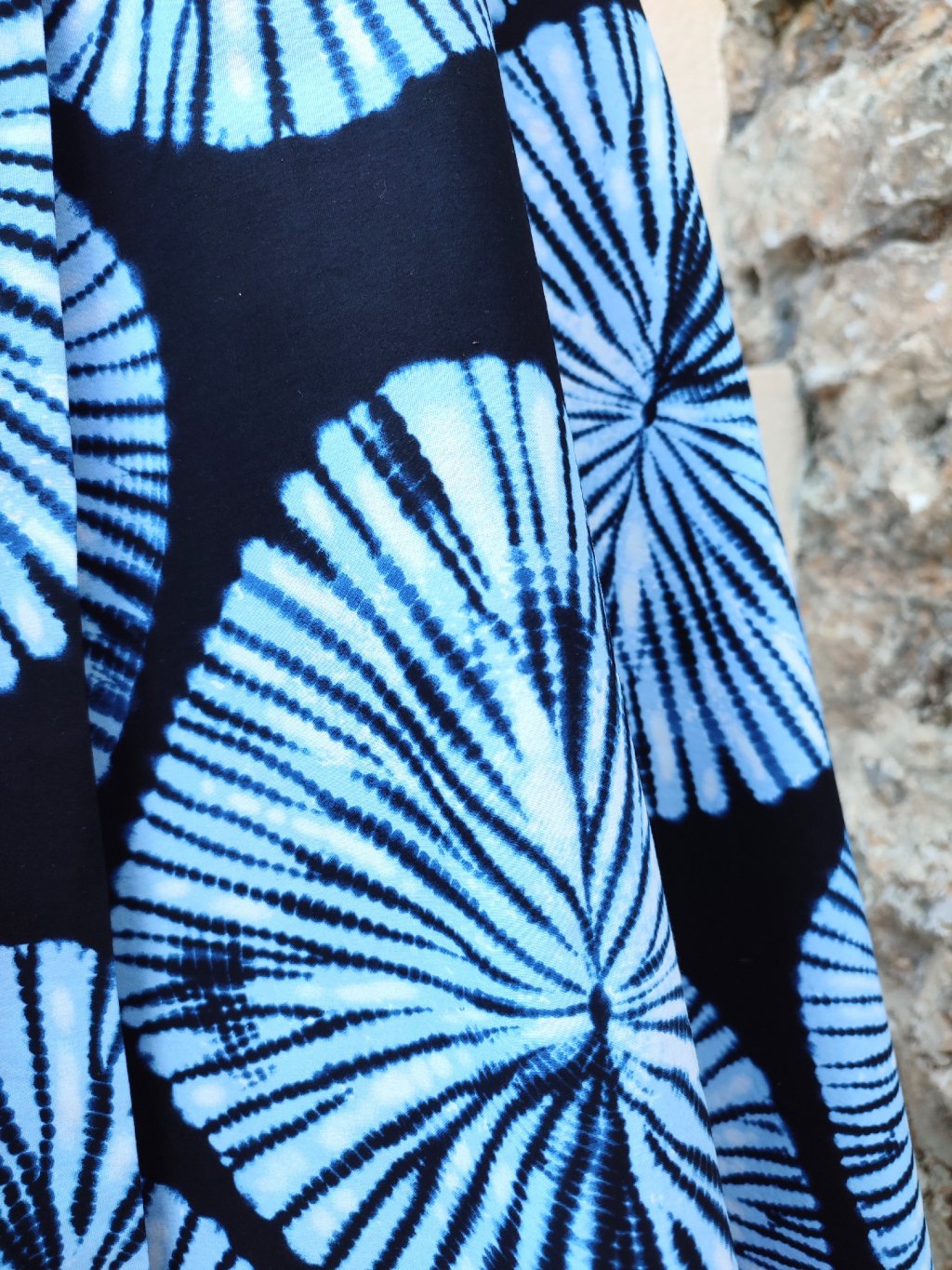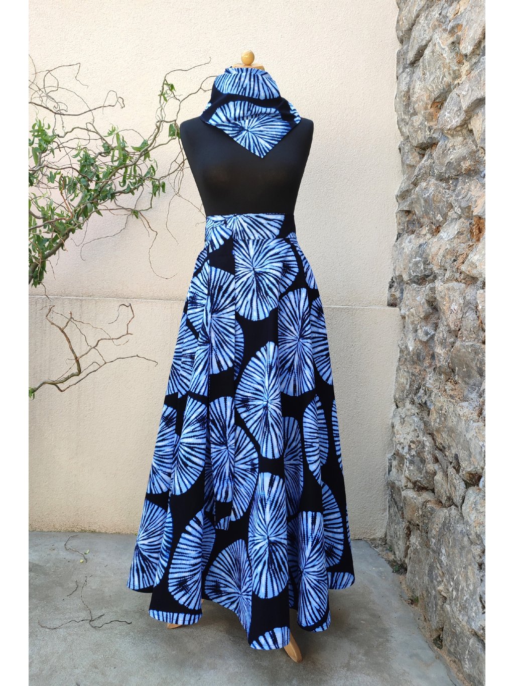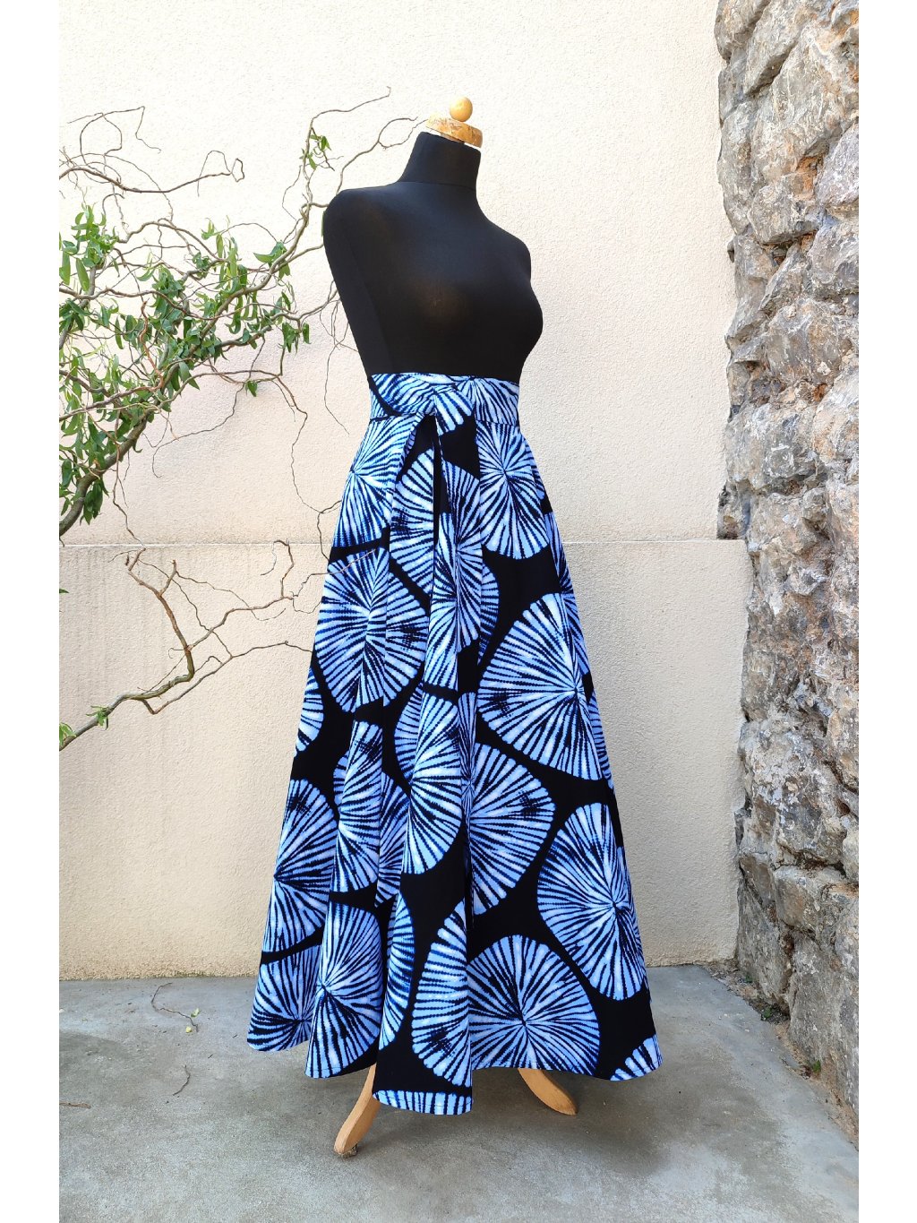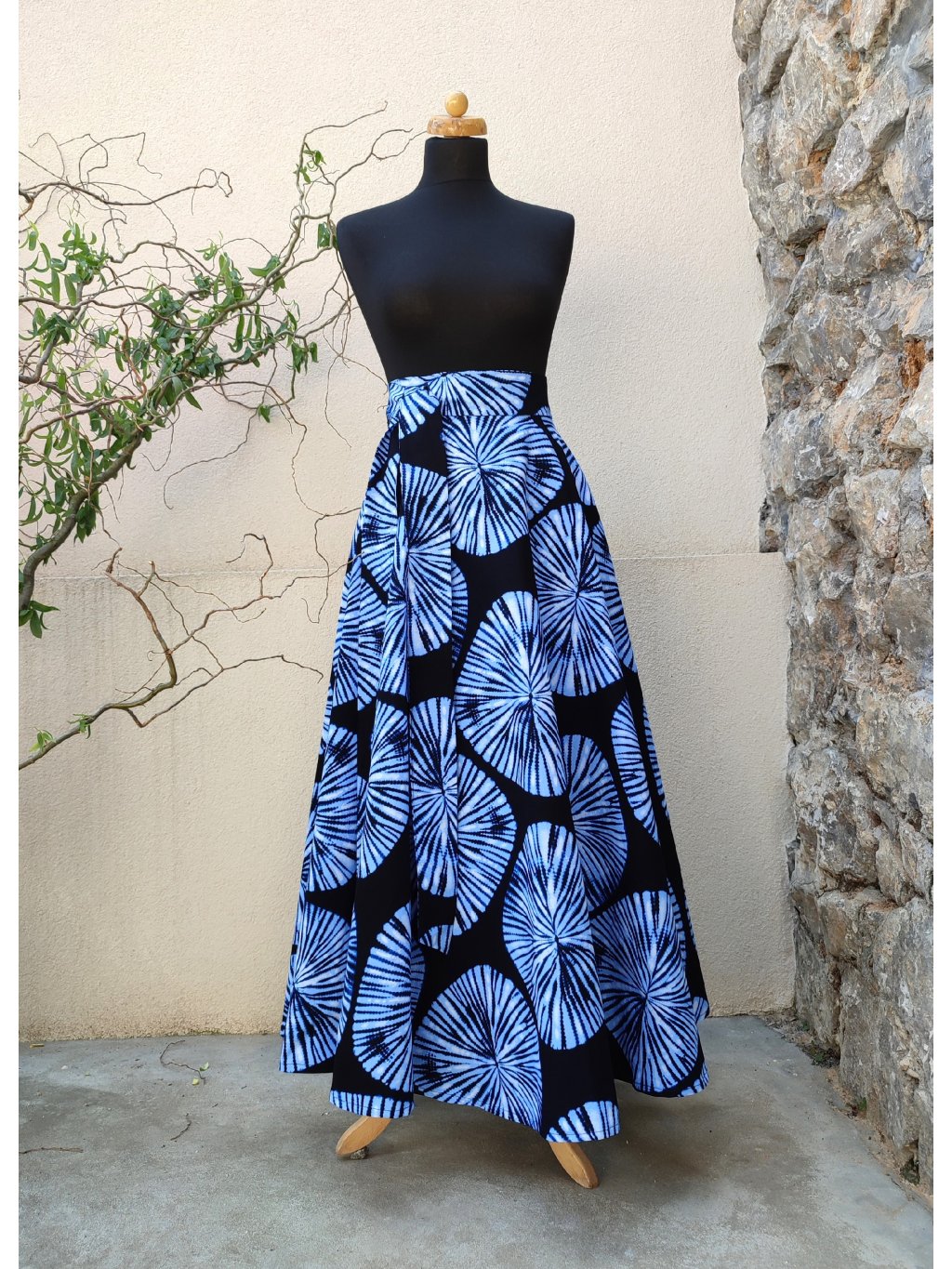 Dlouhá, zavinovací sukně kolového střihu, ušitá z kvalitní bavlny dovezené z Tanzánie.