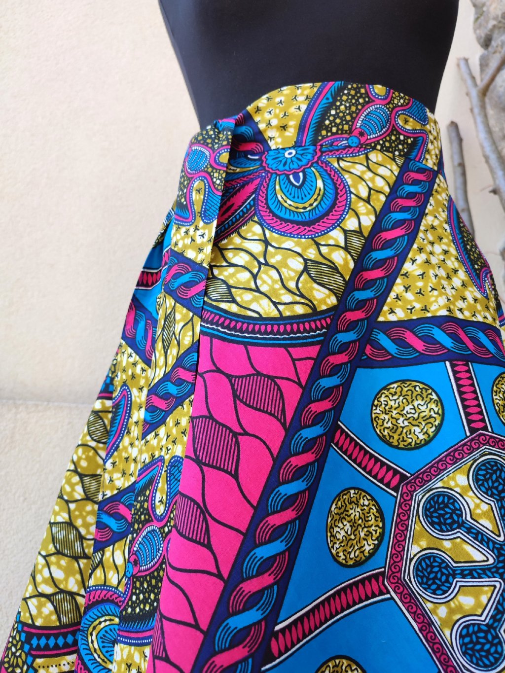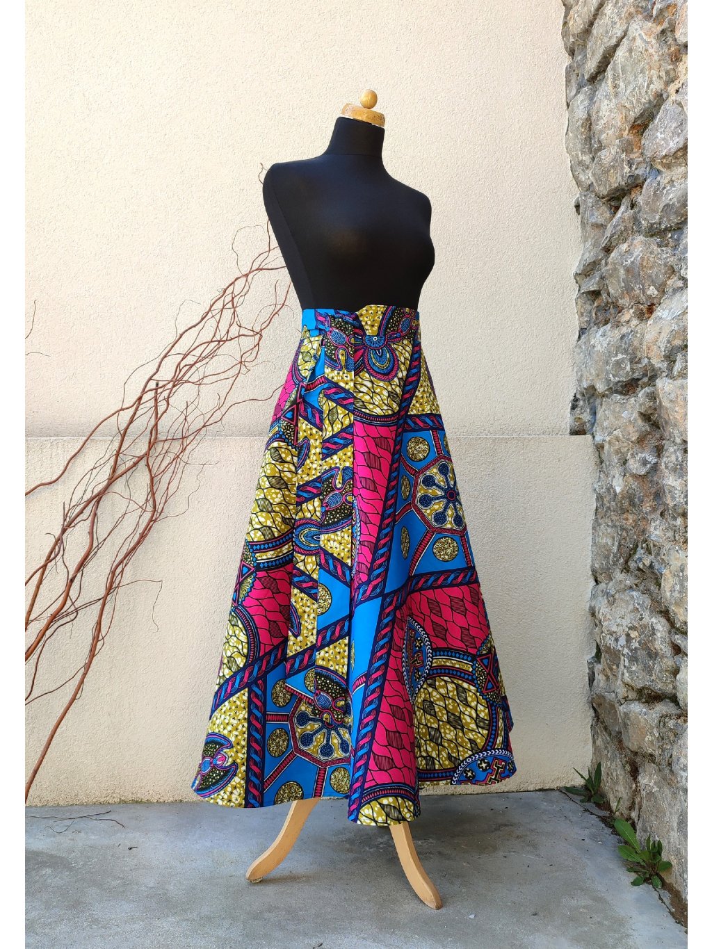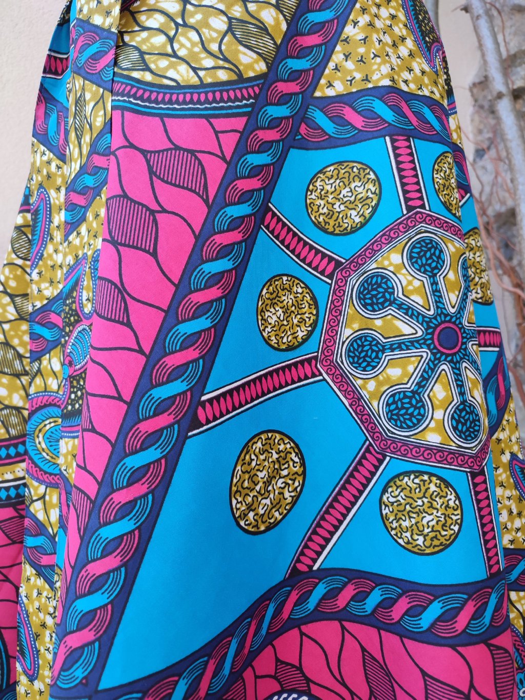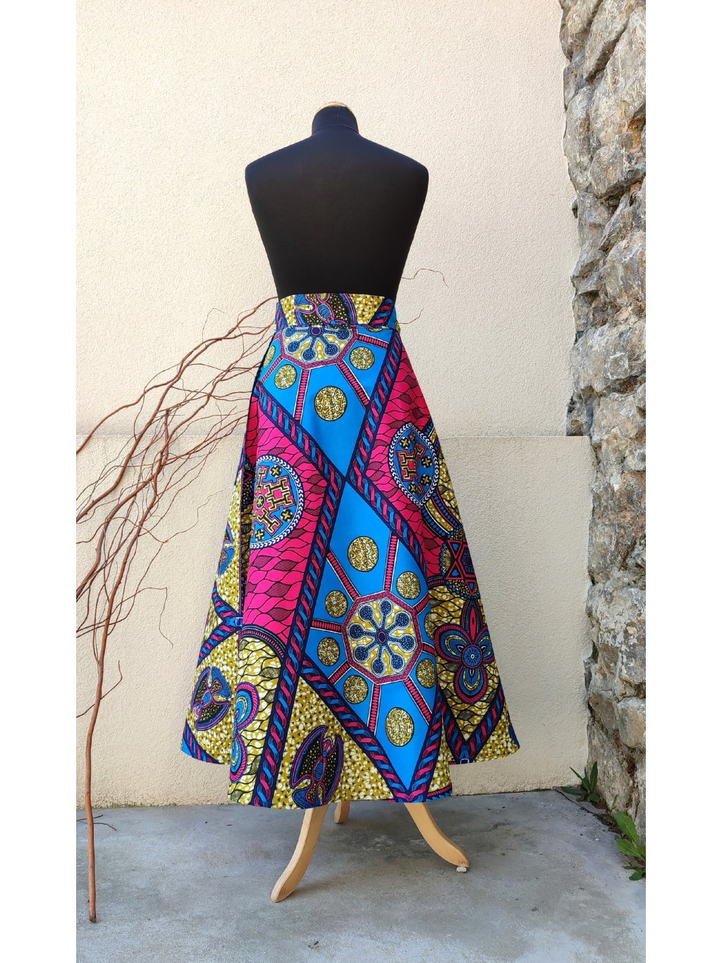 Dlouhá, zavinovací sukénka půlkolového střihu, ušitá z pěkné látky s africkým potiskem.