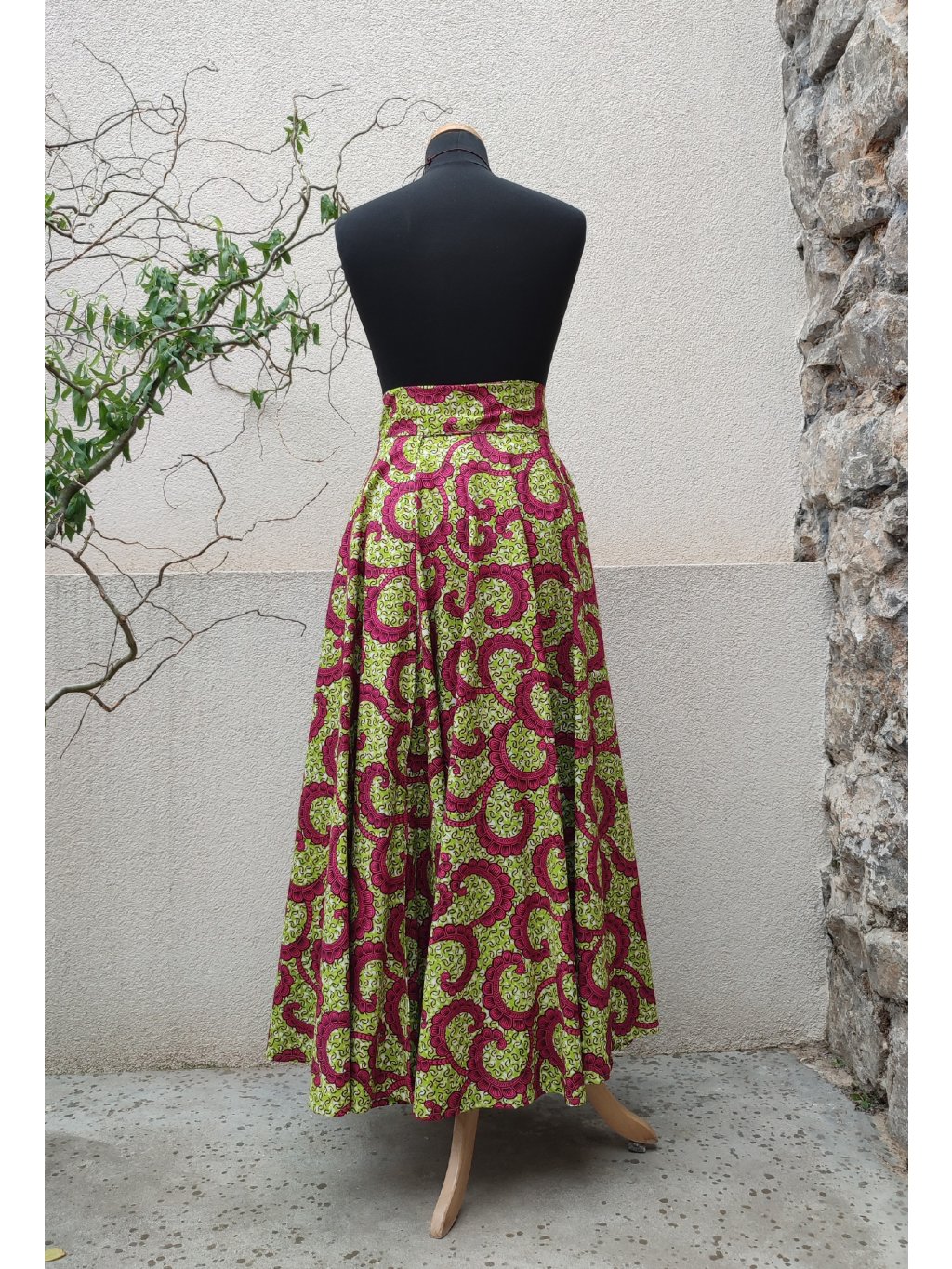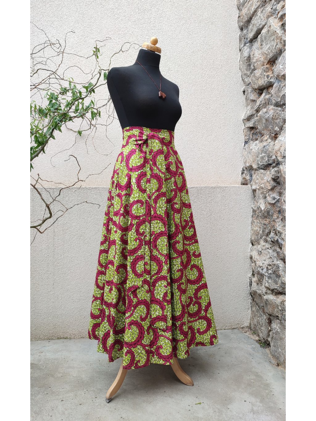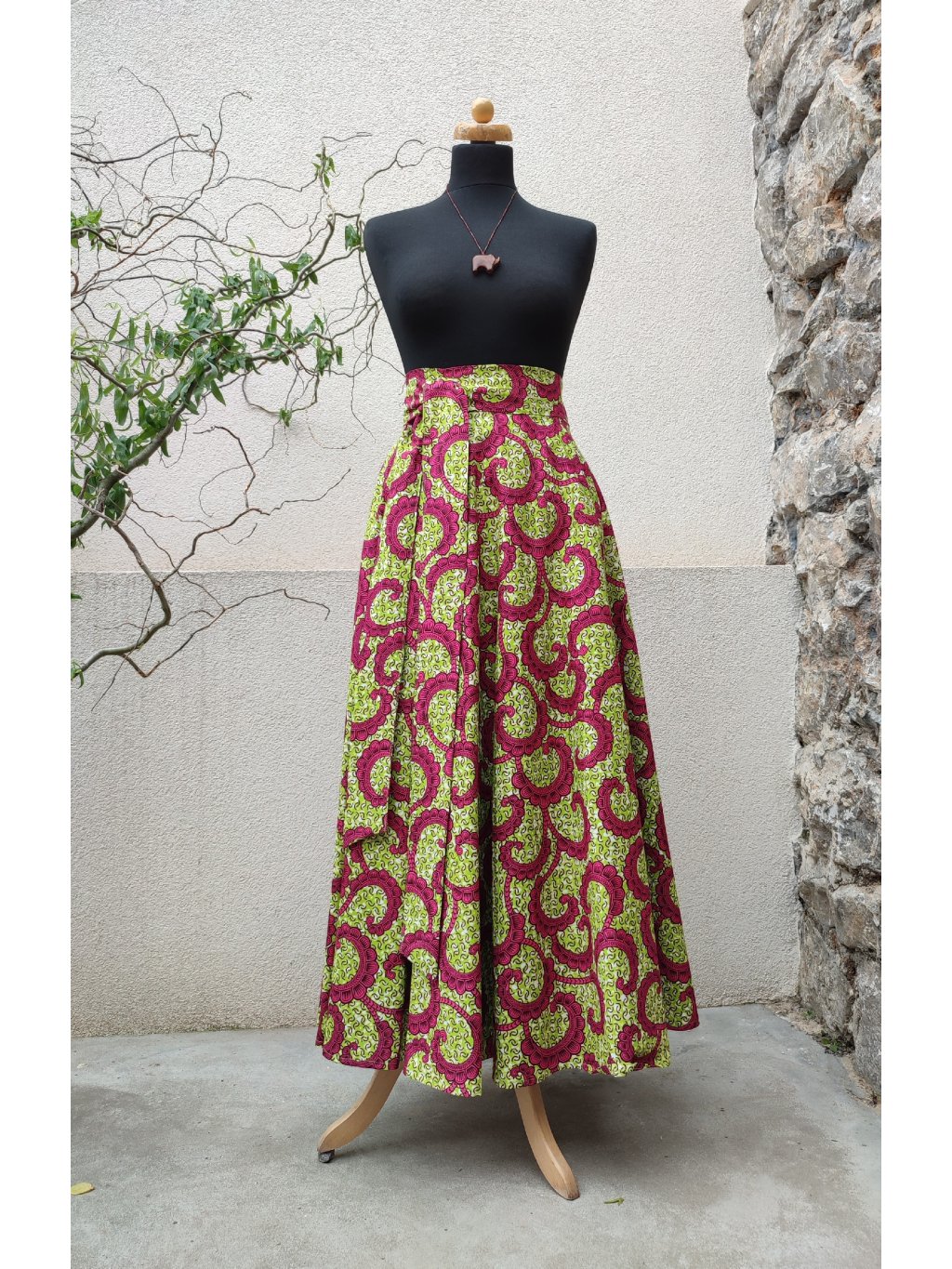 Dlouhá, zavinovací sukně kolového střihu, ušitá z africké látky pestrých barev, veselý vzor.