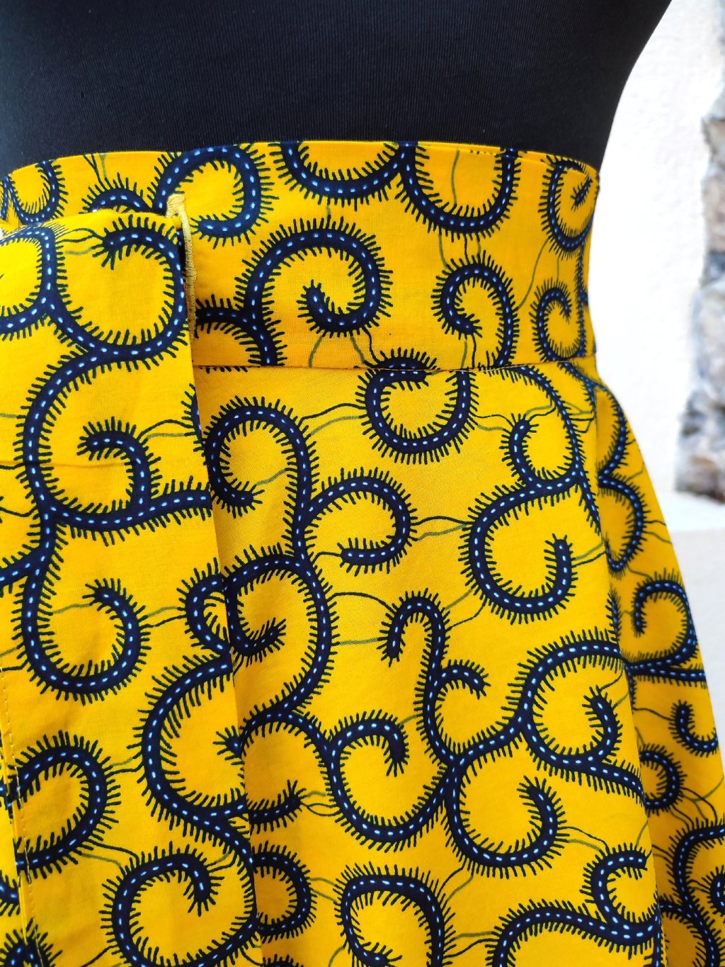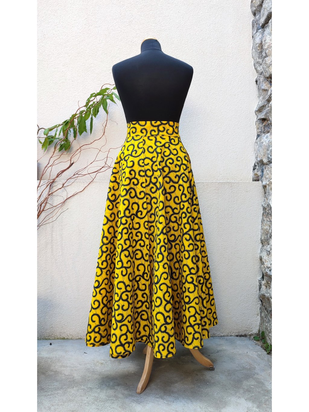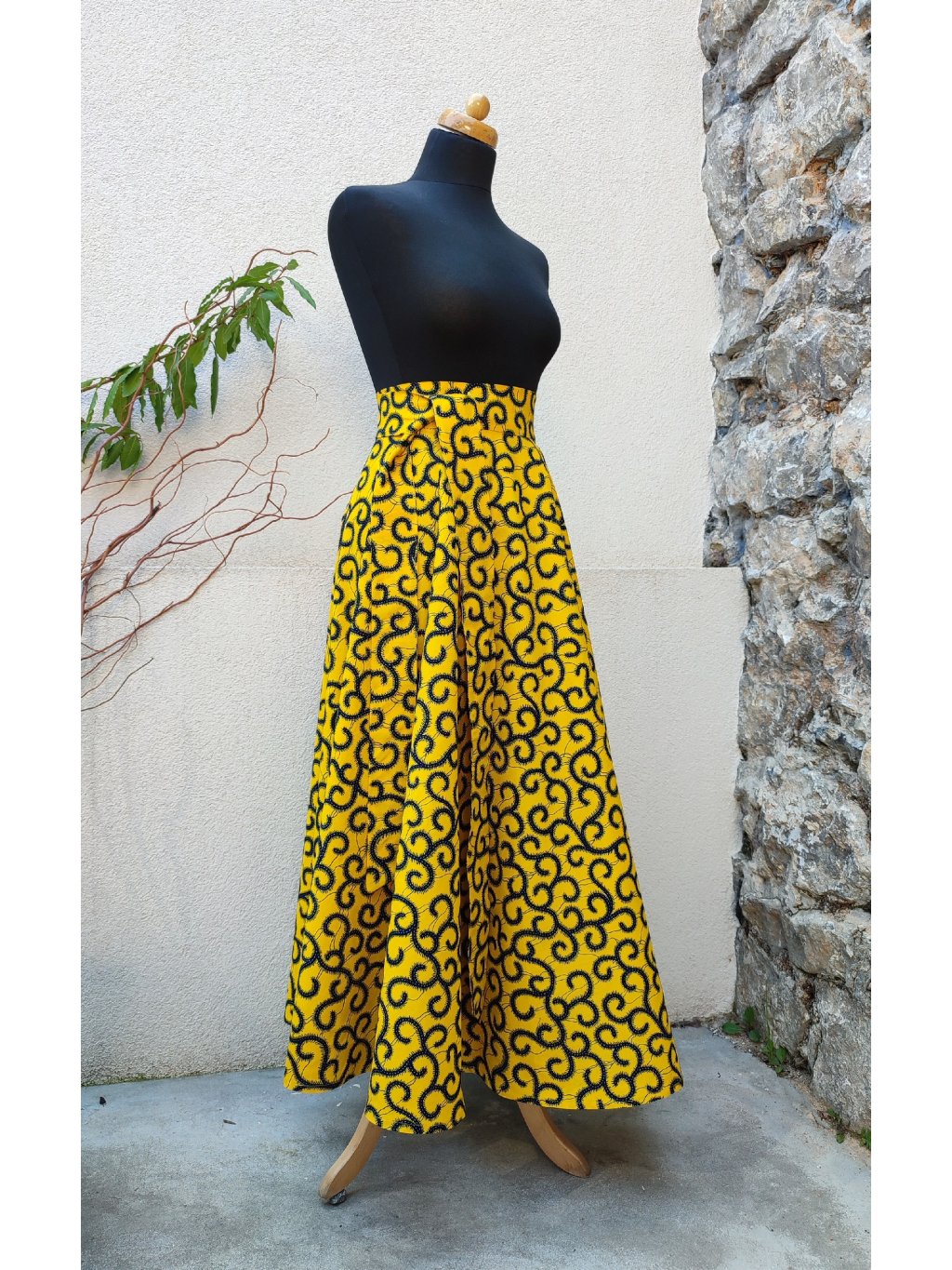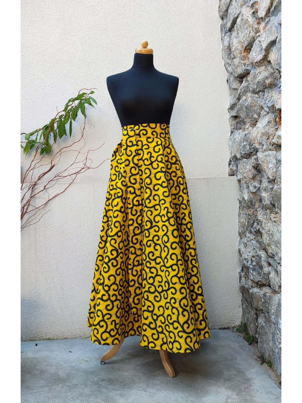 Dlouhá, zavinovací sukně kolového střihu, ušitá z kvalitní bavlny dovezené z Tanzánie.