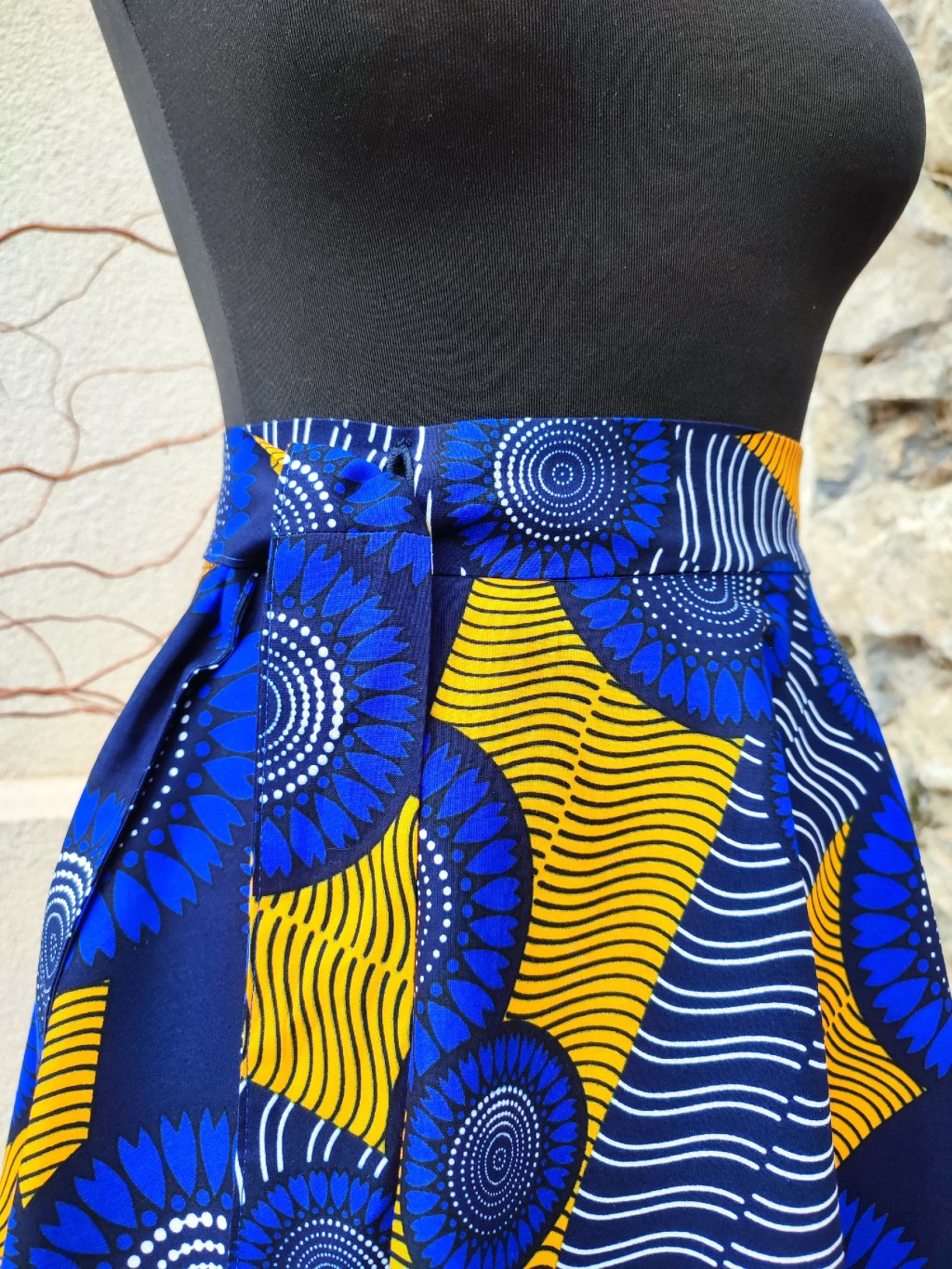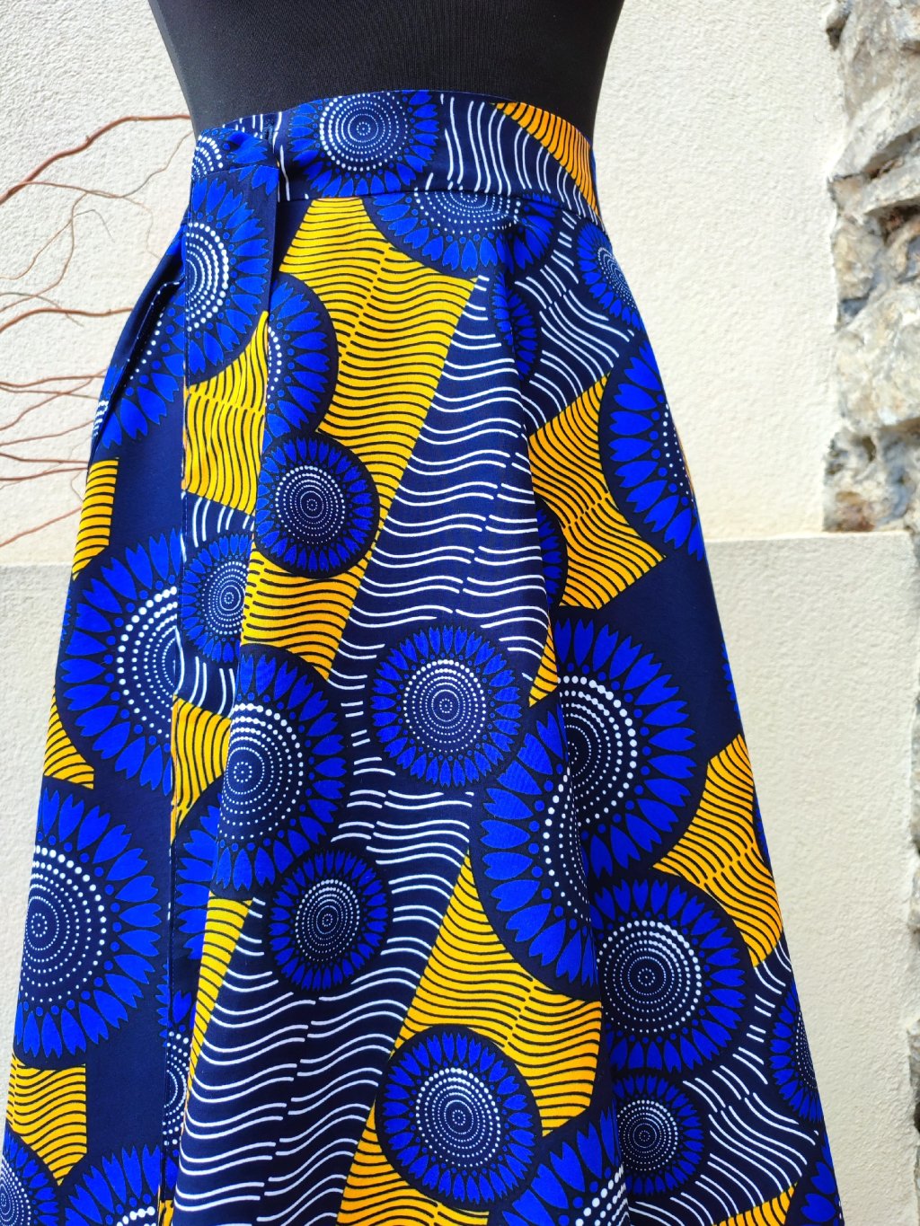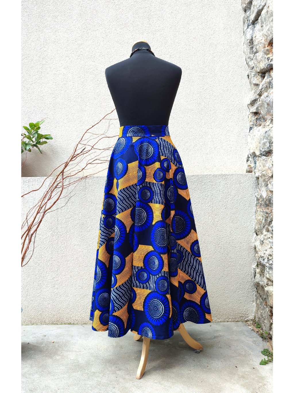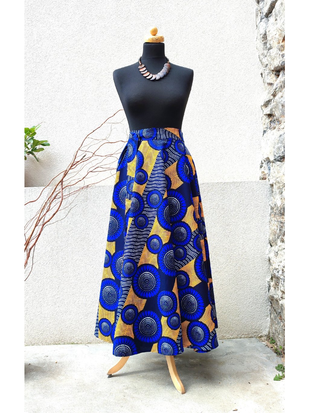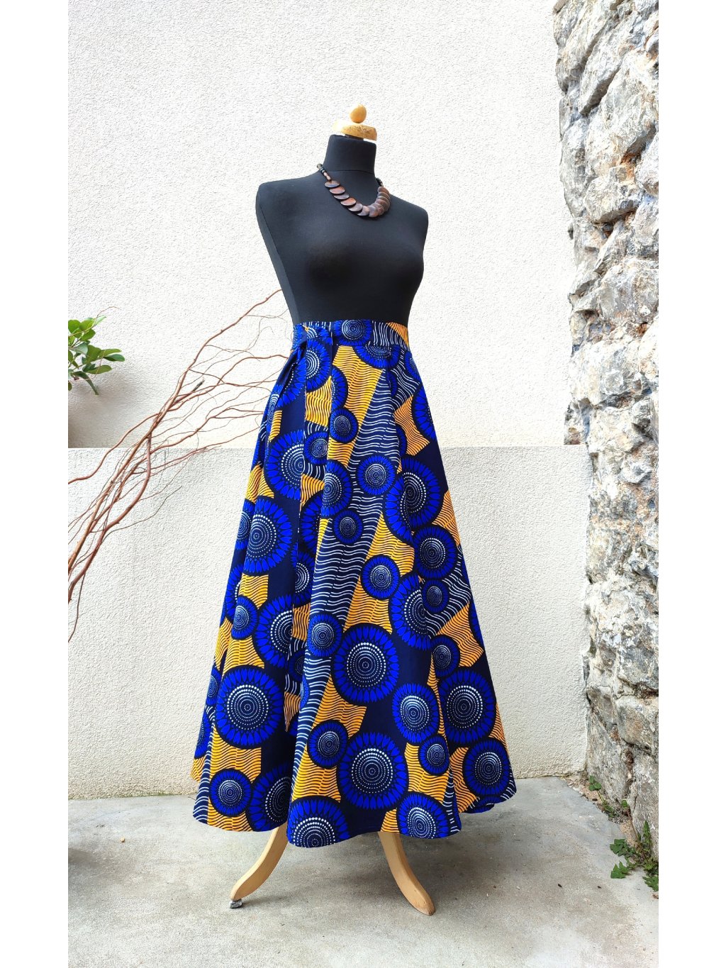 Dlouhá, zavinovací sukně kolového střihu, ušitá z kvalitní bavlny dovezené z Tanzánie.