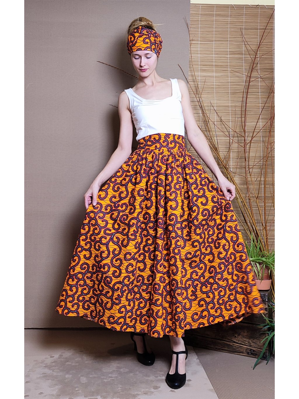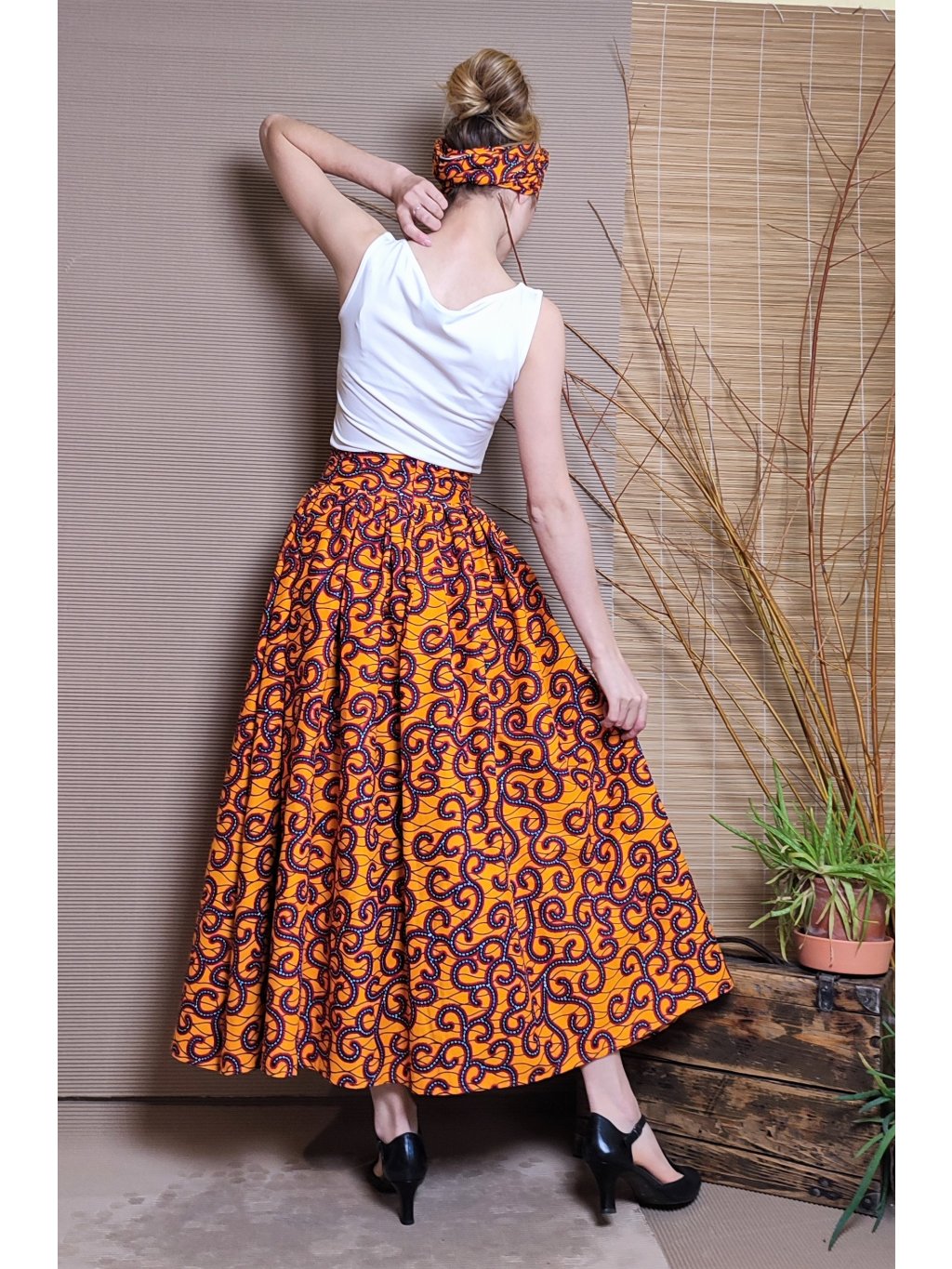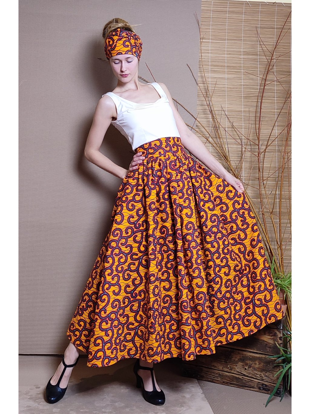 Velmi bohatá, originální sukně z oranžové látky s africkým designem.