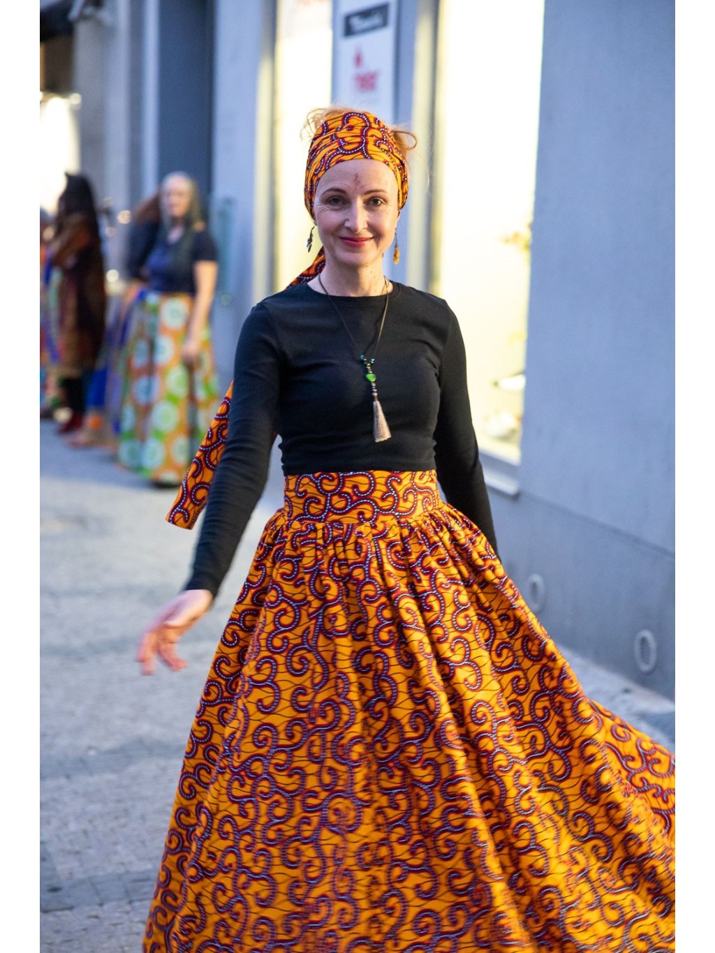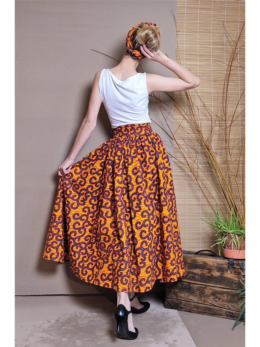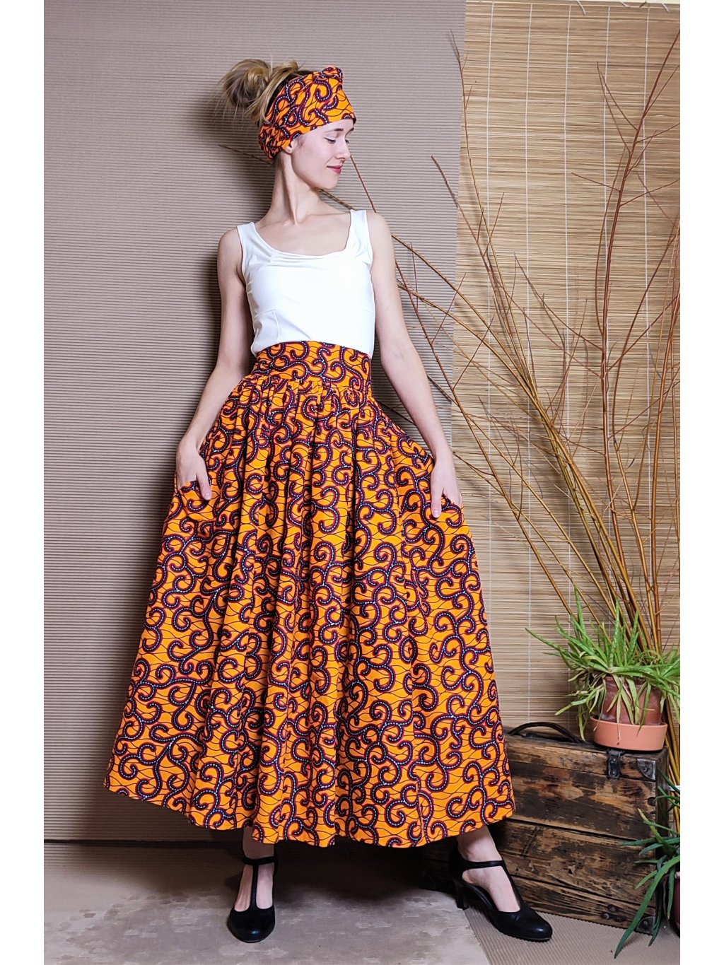 Velmi bohatá, originální sukně z oranžové látky s africkým designem.