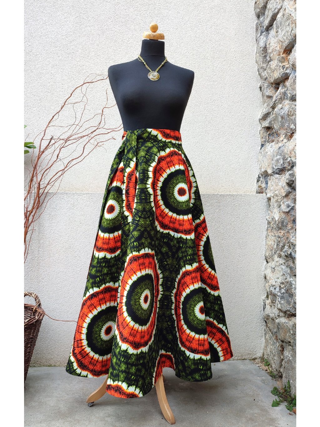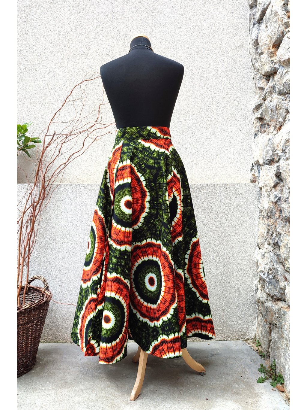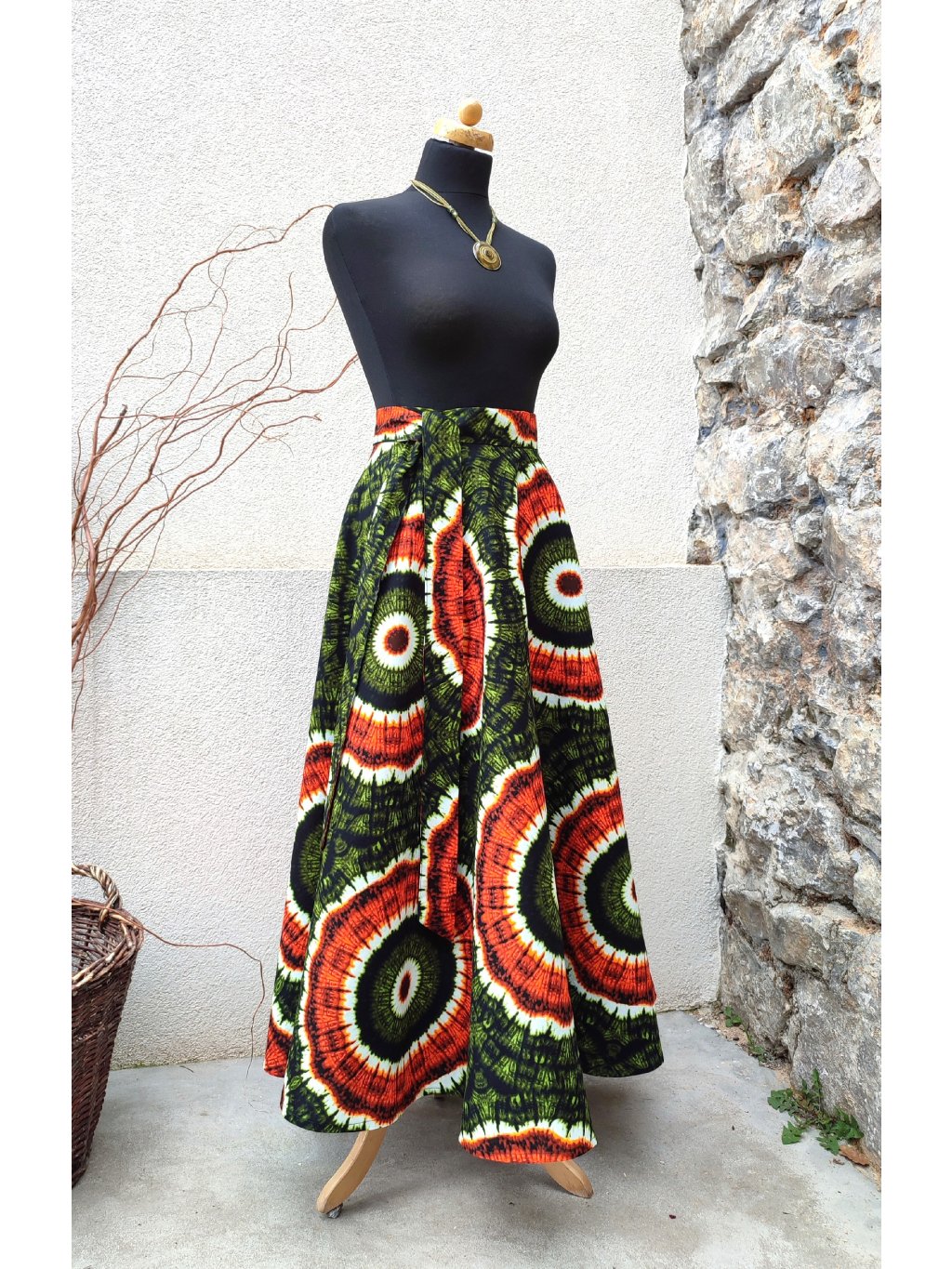 Dlouhá, zavinovací sukně kolového střihu, ušitá z kvalitní bavlny dovezené z Tanzánie.
