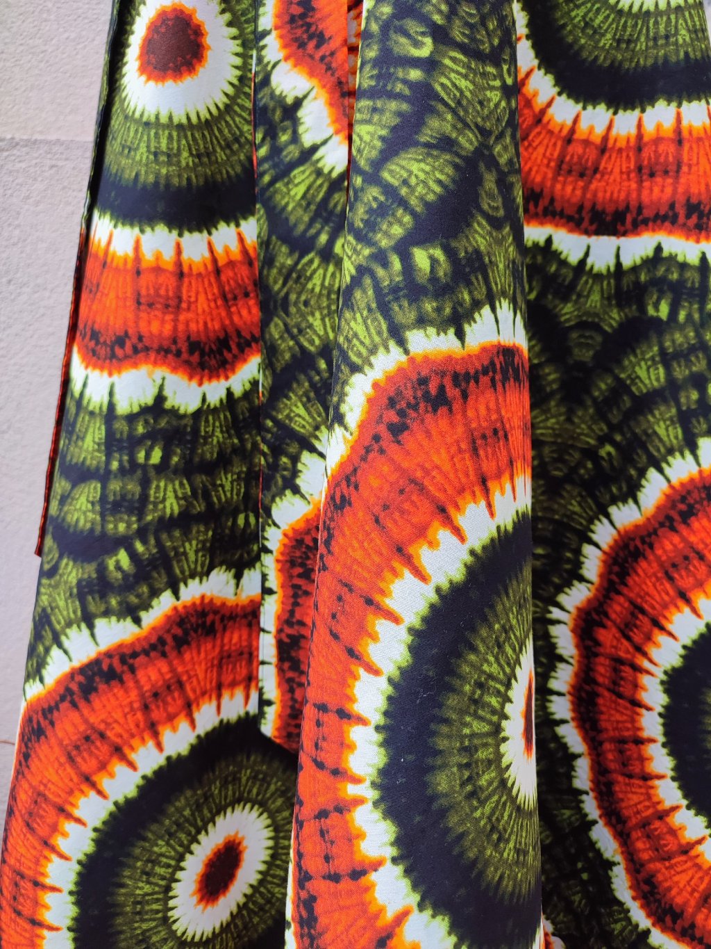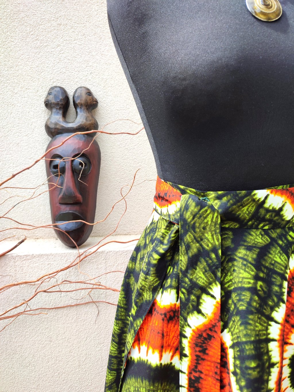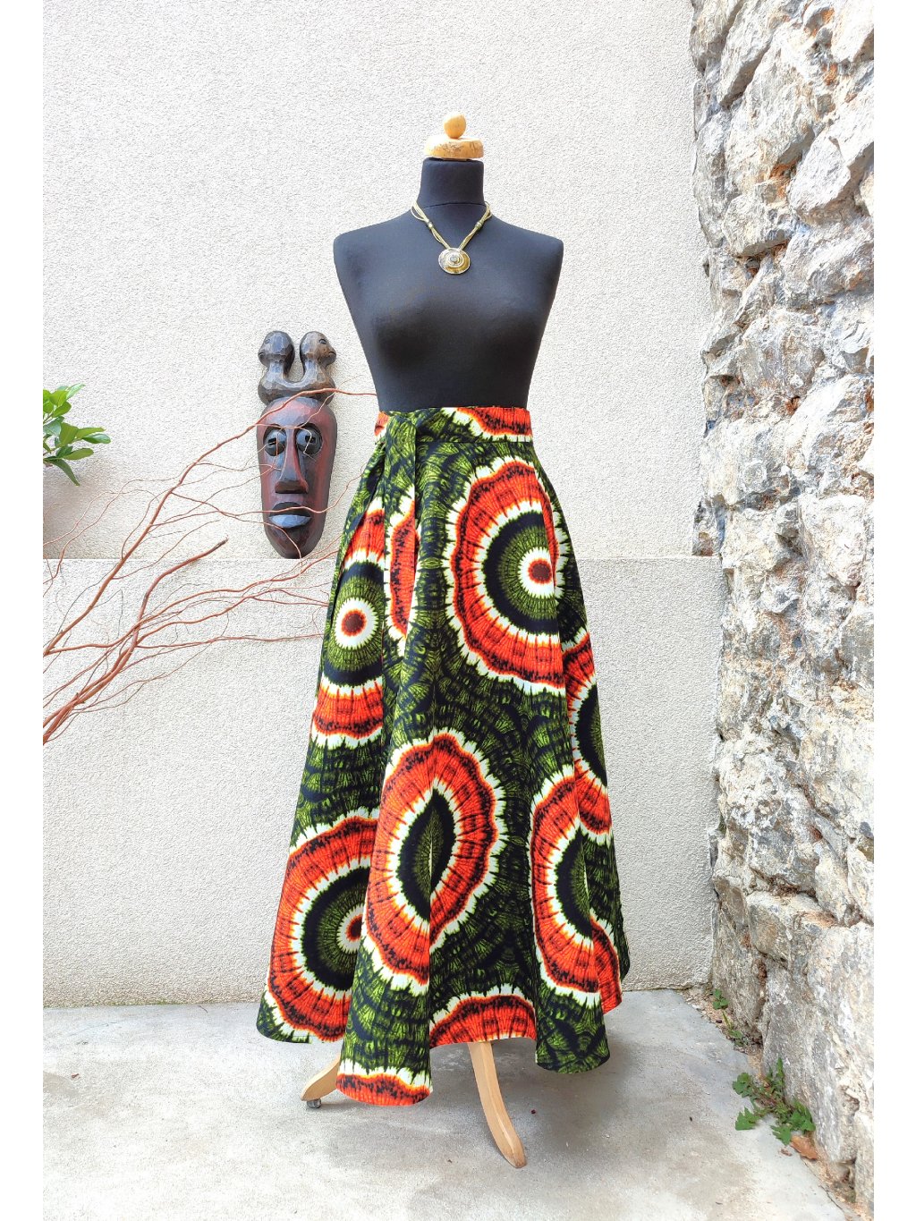 Dlouhá, zavinovací sukně kolového střihu, ušitá z kvalitní bavlny dovezené z Tanzánie.