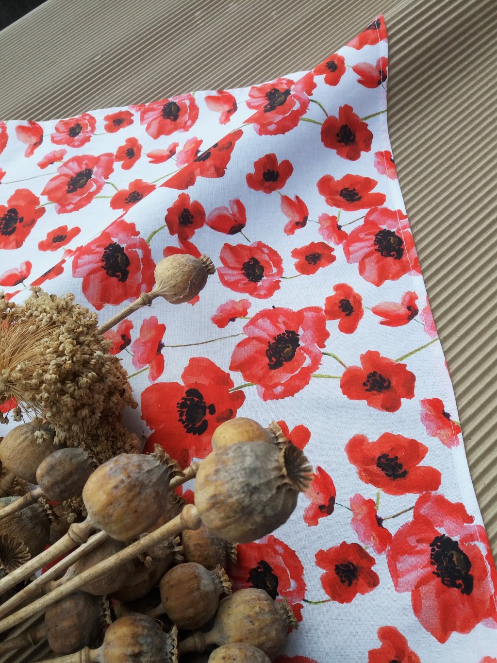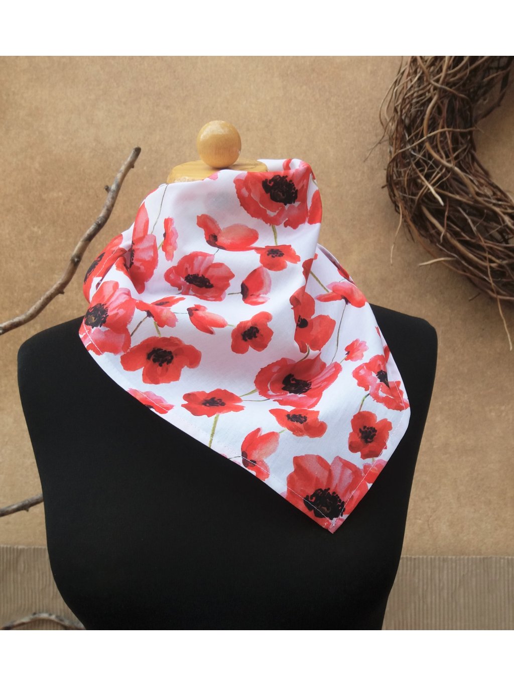 Šátek ušitý ze 100% hebké bavlny, bílý podklad s tiskem makových květů.