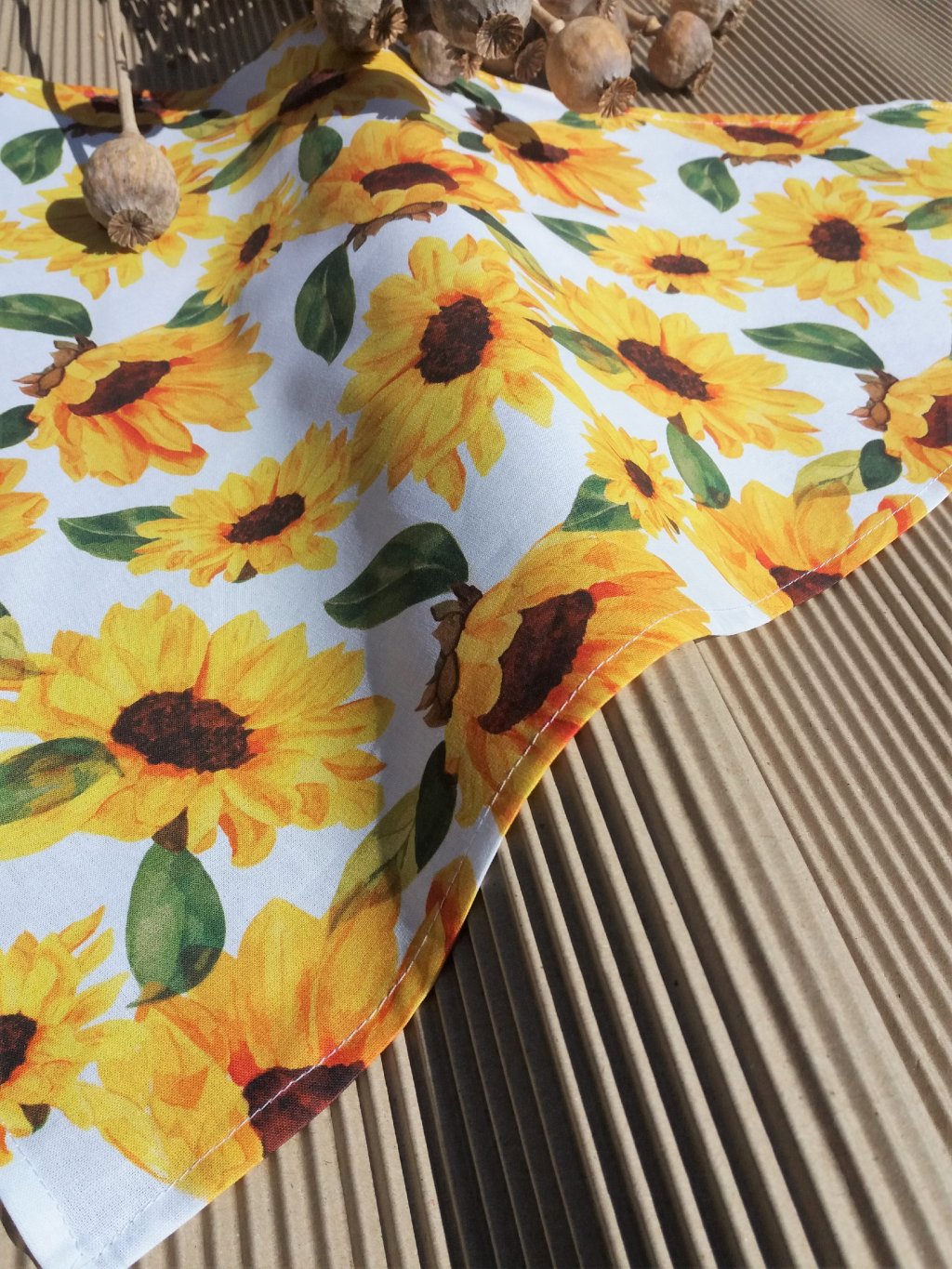 Šátek ušitý ze 100% hebké bavlny, bílý podklad s tiskem slunečnic.