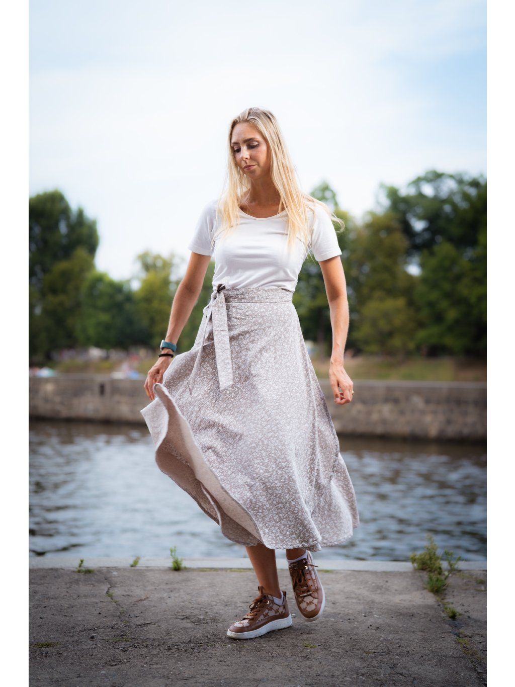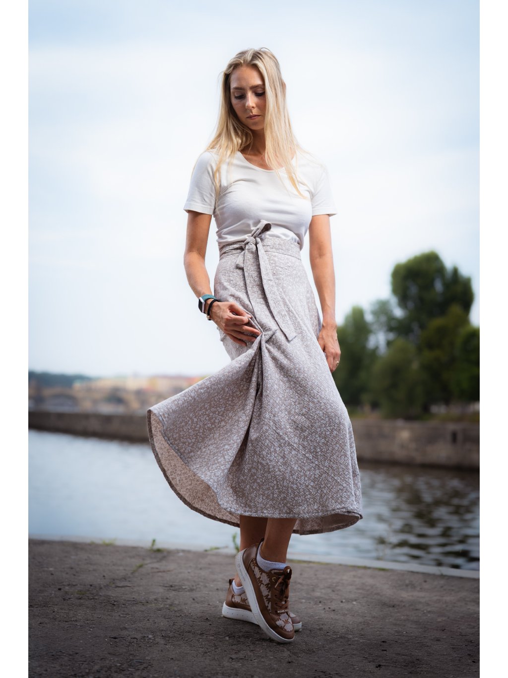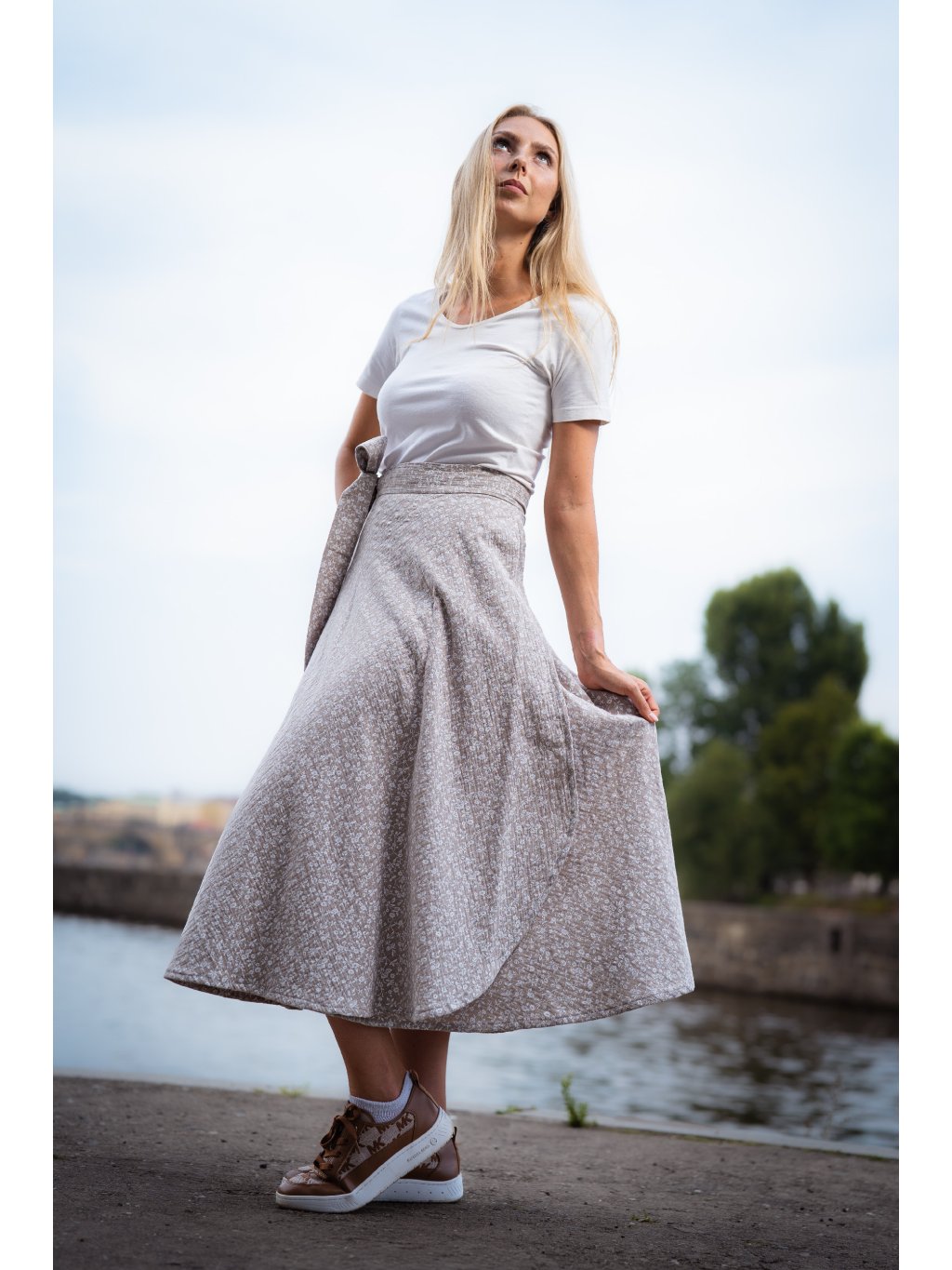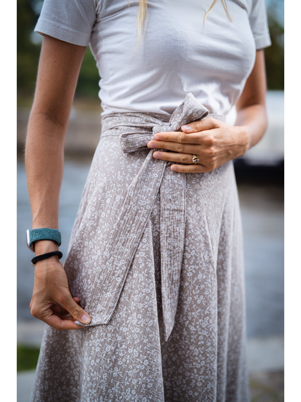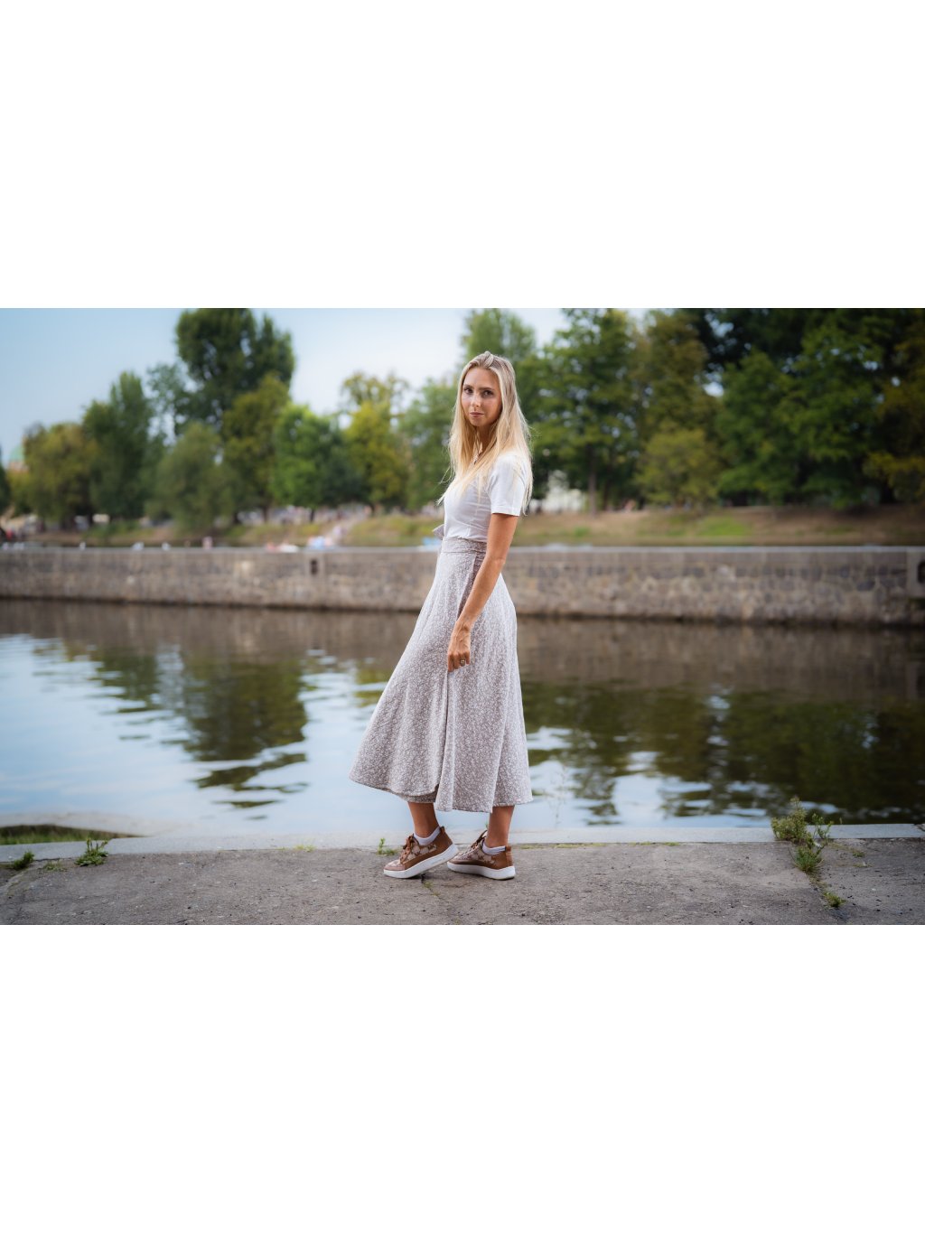 Něžná , dlouhá mušelínová sukně v barvě bílé kávy s drobnými bílými kvítky.