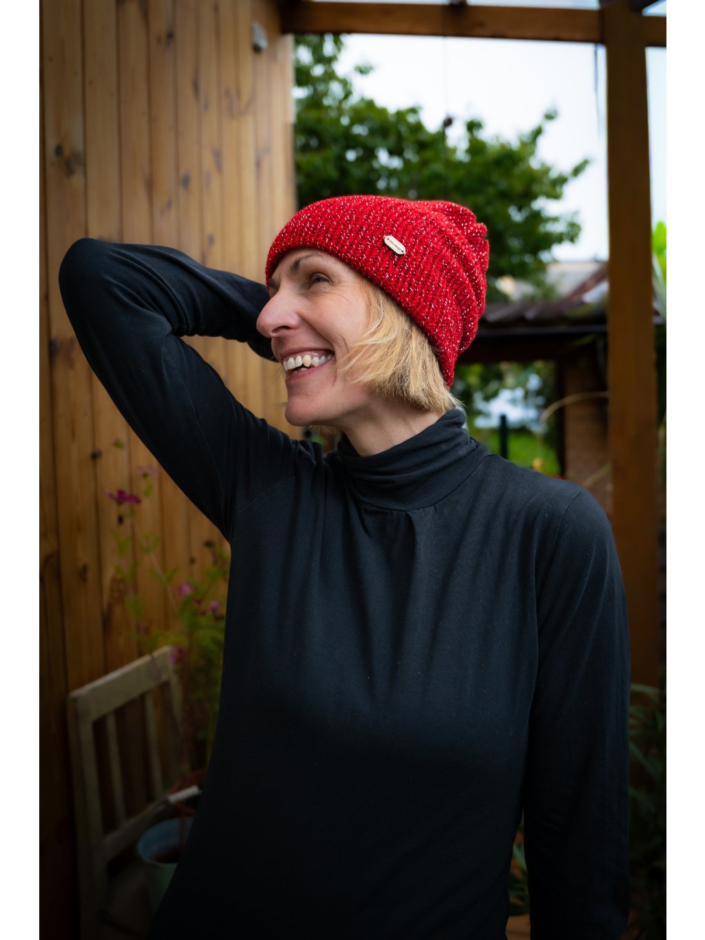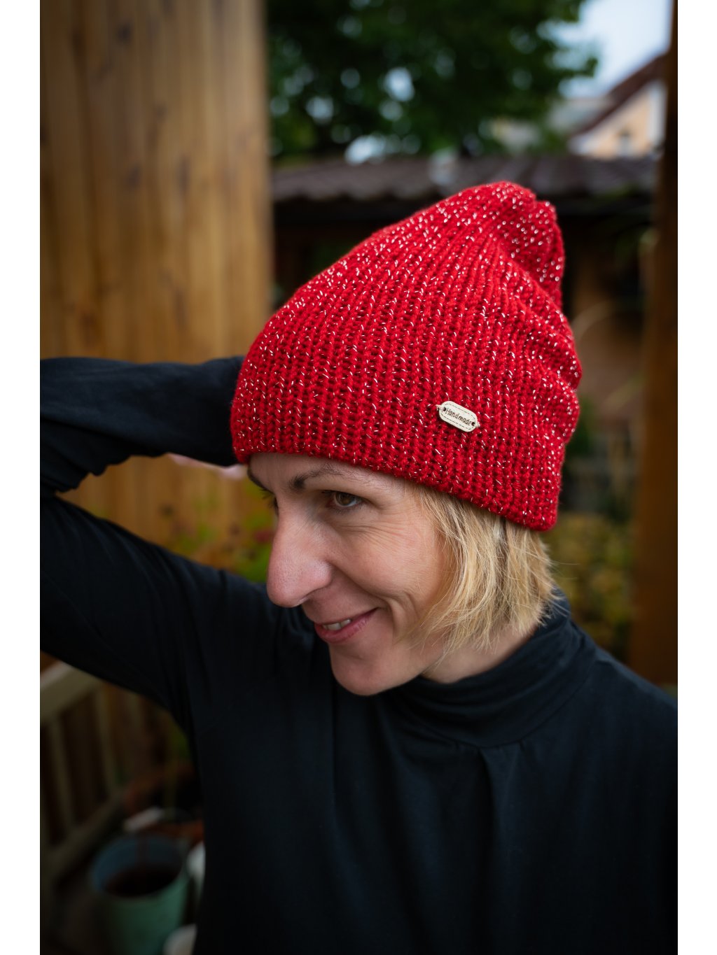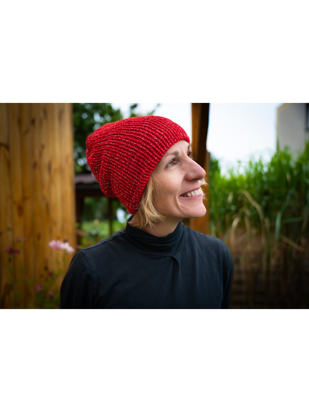 Tato ručně pletená čepice je vyrobena na pletacím mlýnku z vysoce kvalitní příze složené z 73 % akrylu, 24 % vlny z lamy a 3 % metalického vlákna.