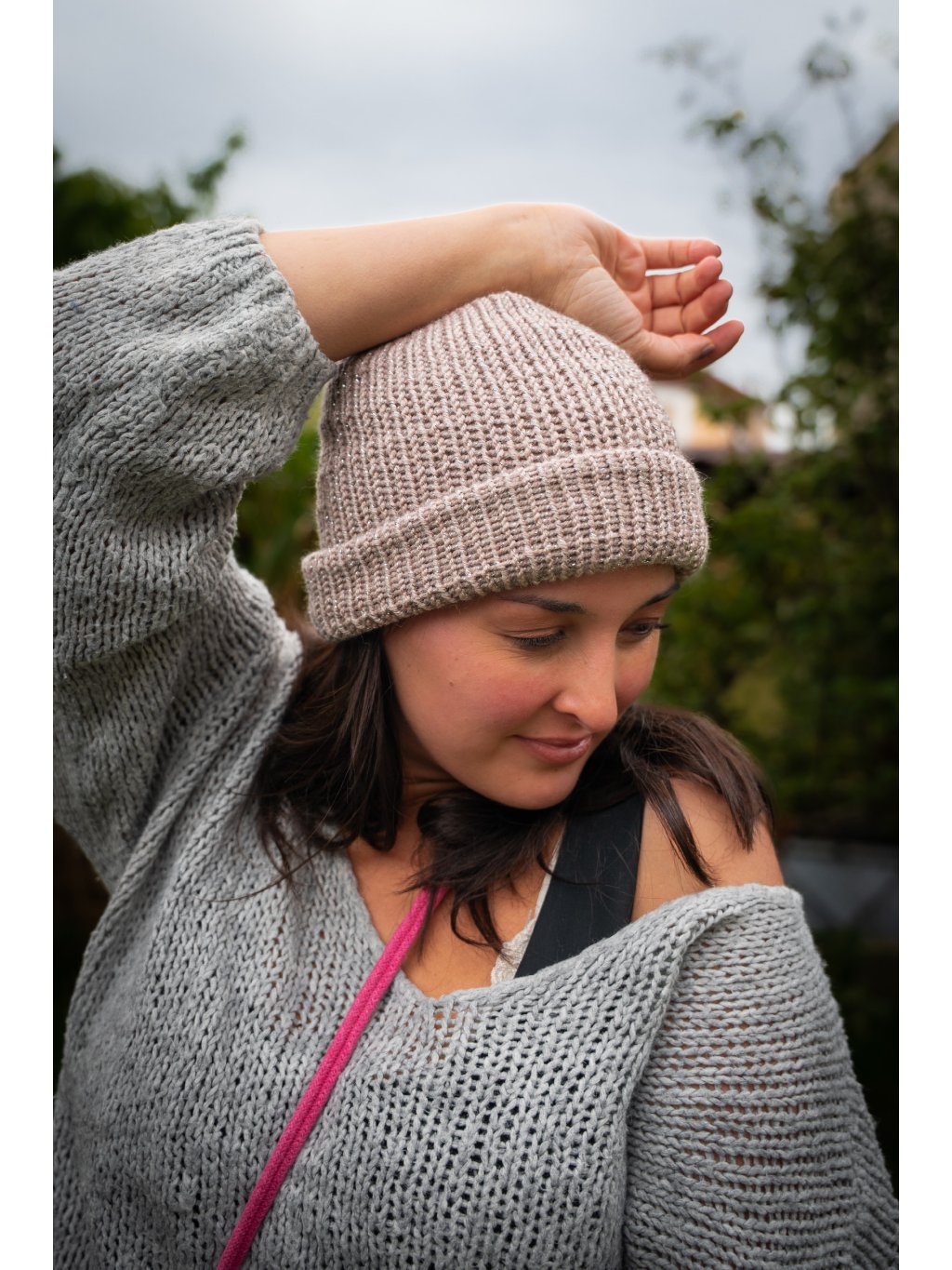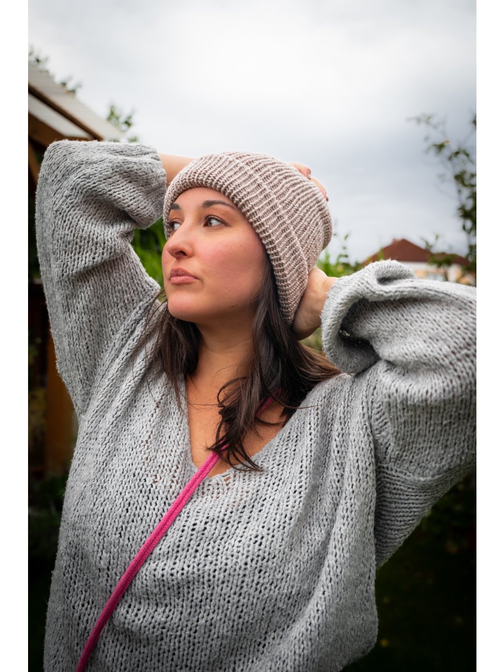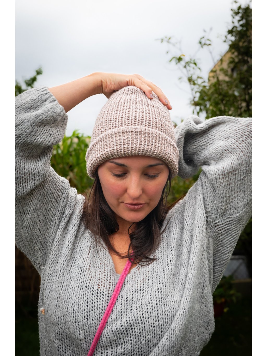 Tato ručně pletená čepice je vyrobena na pletacím mlýnku z vysoce kvalitní příze složené z 73 % akrylu, 24 % vlny z lamy a 3 % metalického vlákna.