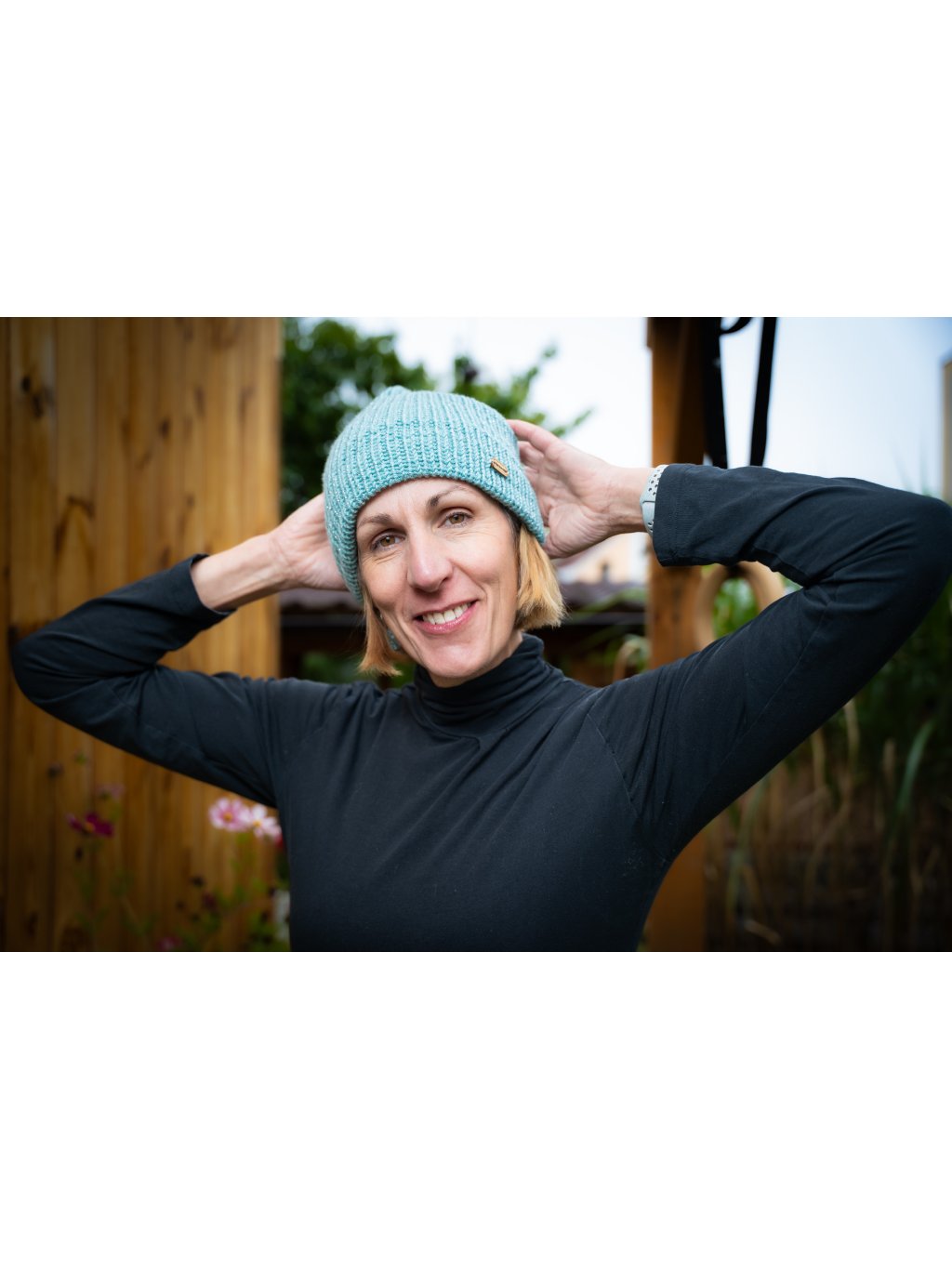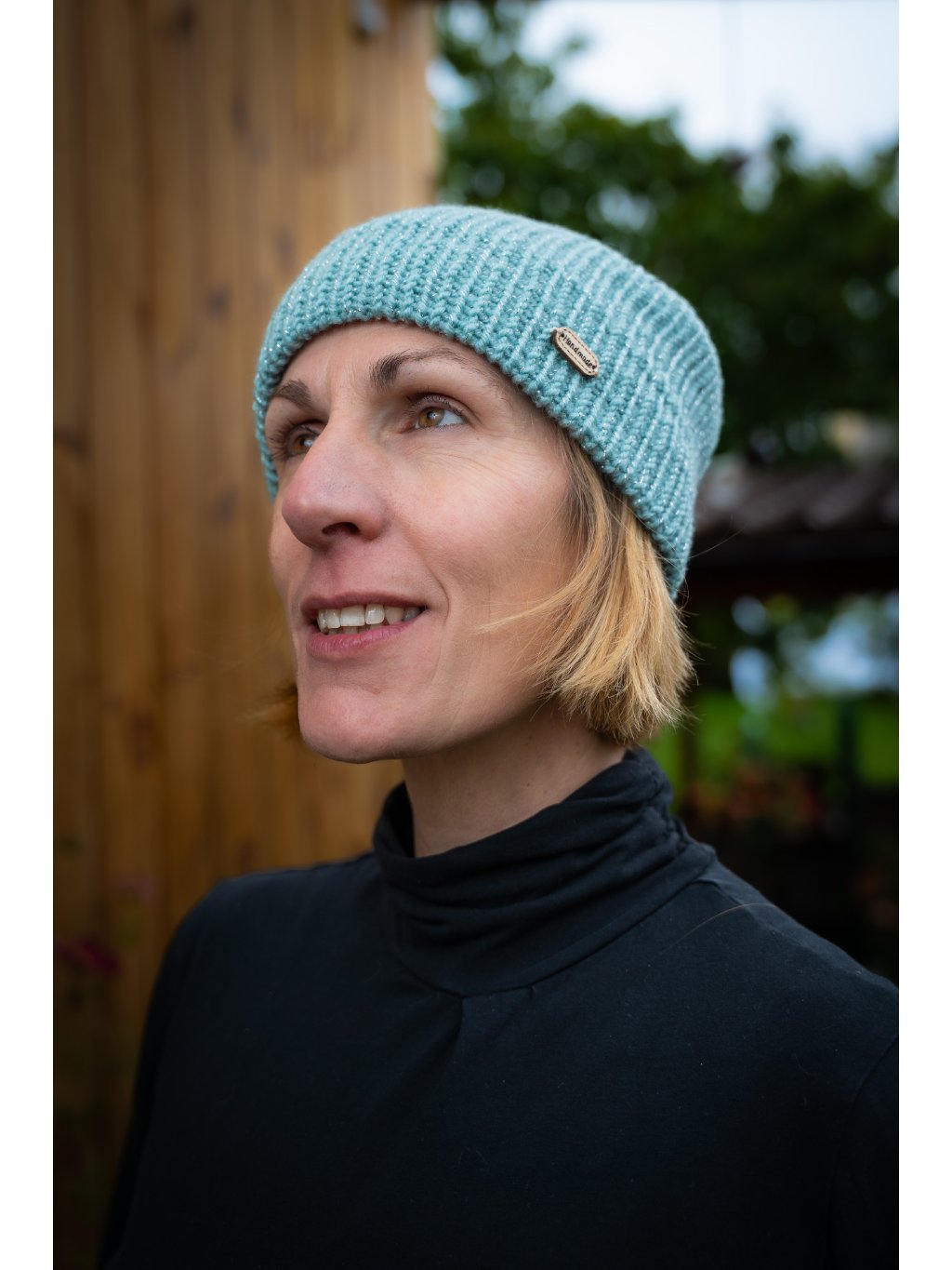 Tato ručně pletená čepice je vyrobena na pletacím mlýnku z vysoce kvalitní příze složené z 73 % akrylu, 24 % vlny z lamy a 3 % metalického vlákna.