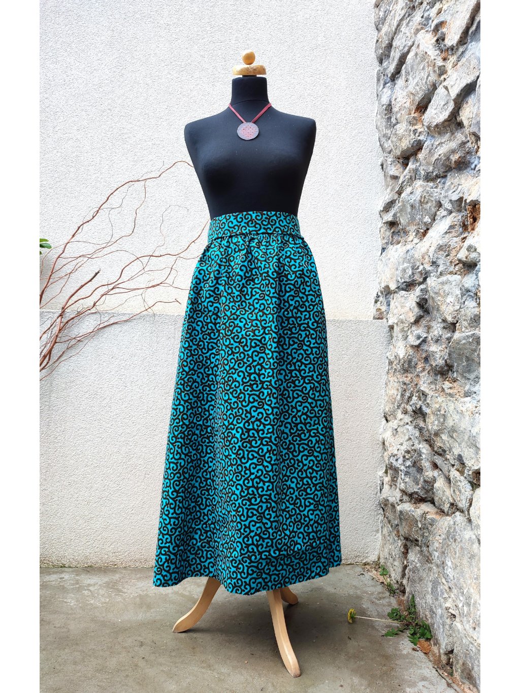 Dlouhá sukně ušitá z africké látky pestré tyrkysové barvy.