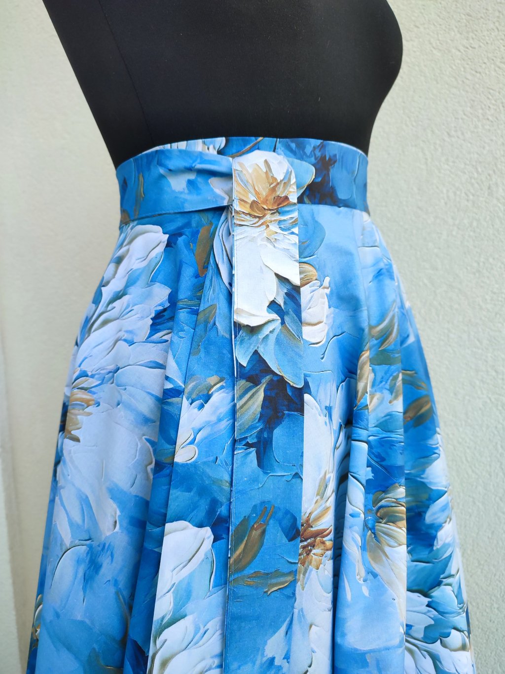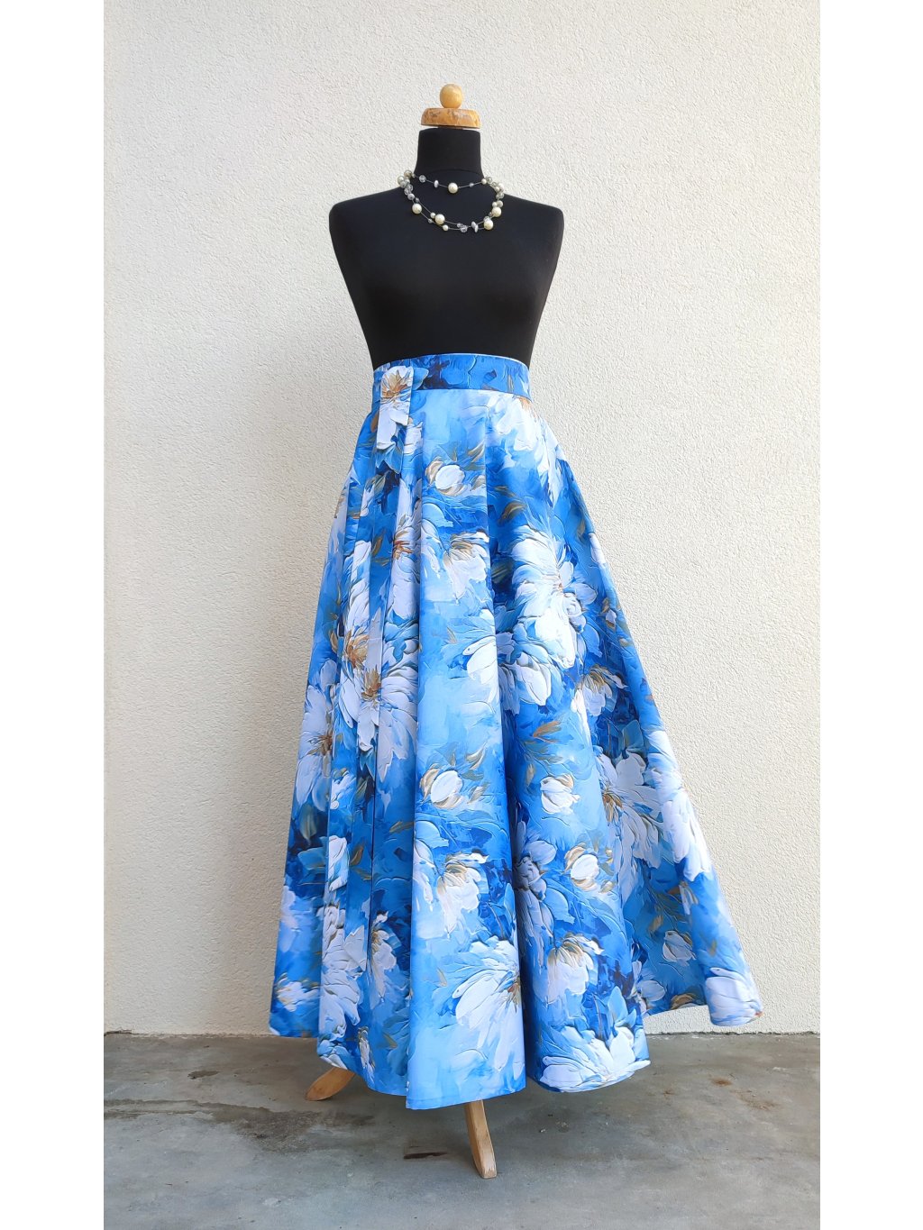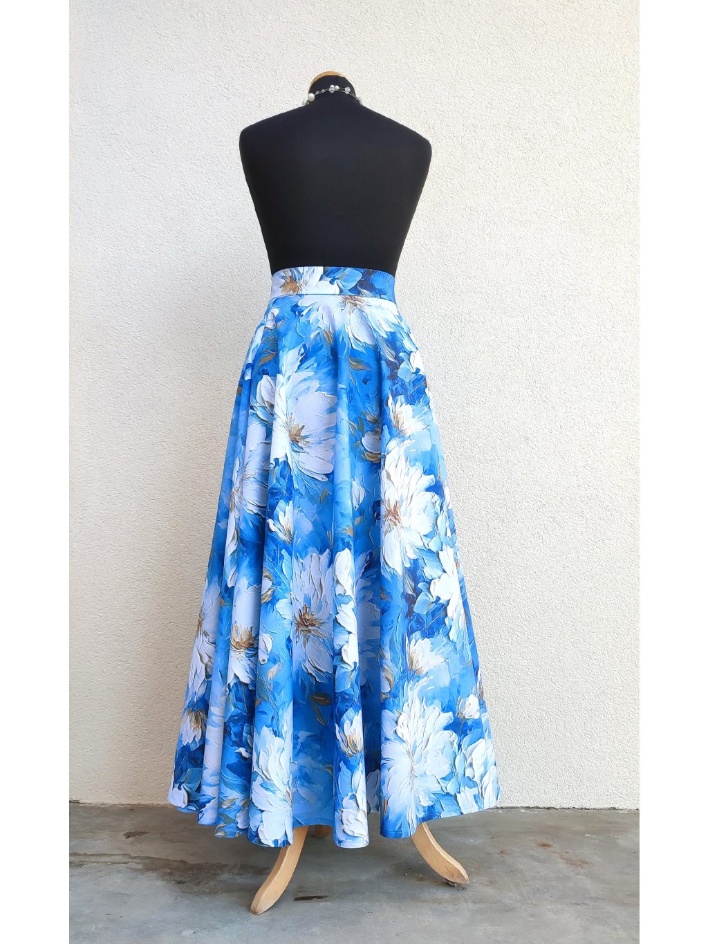 Dlouhá kolová sukně - modrá s bílými květy
