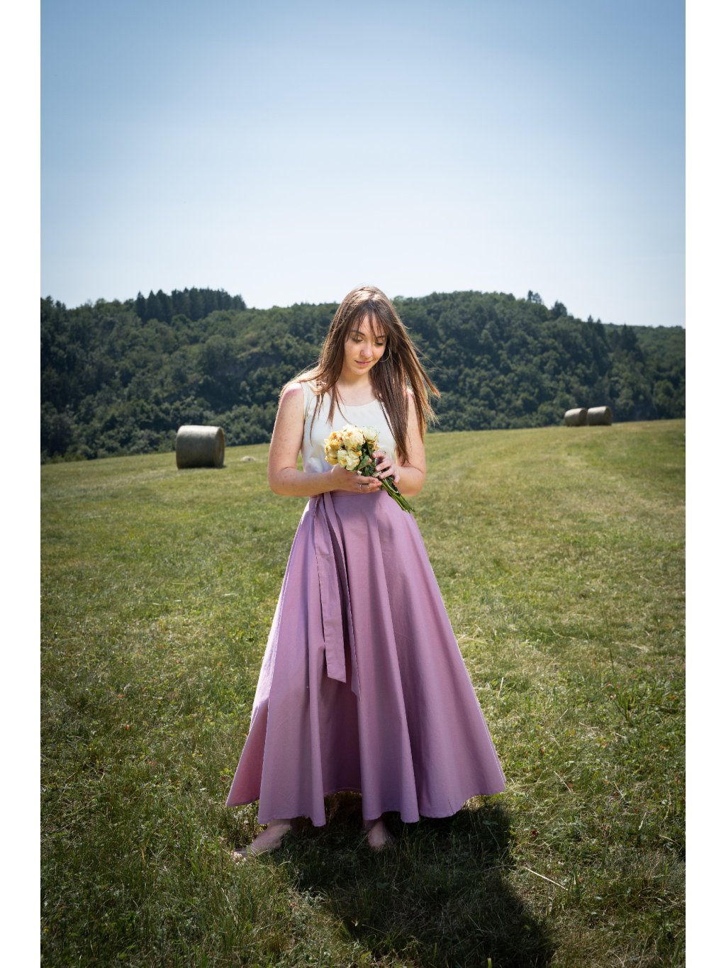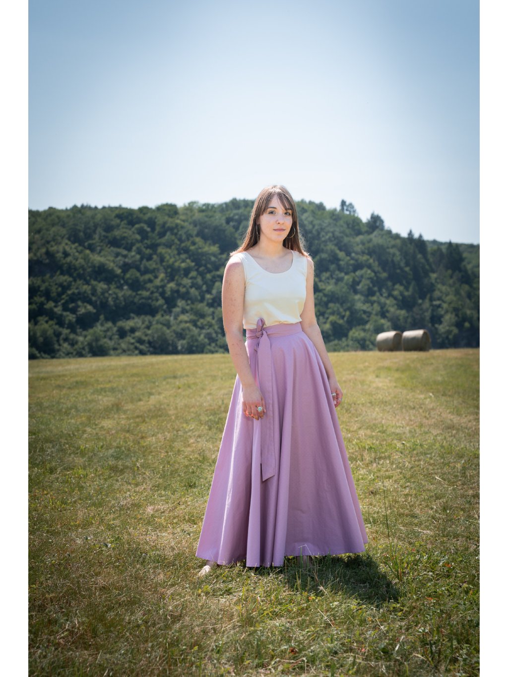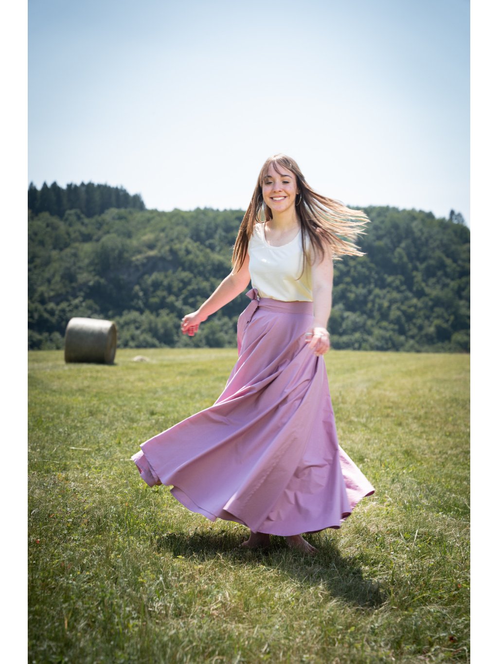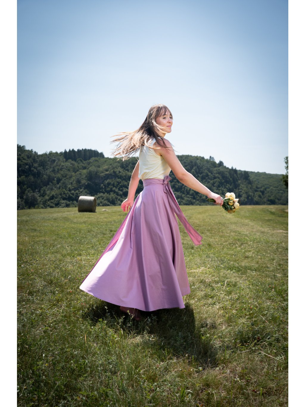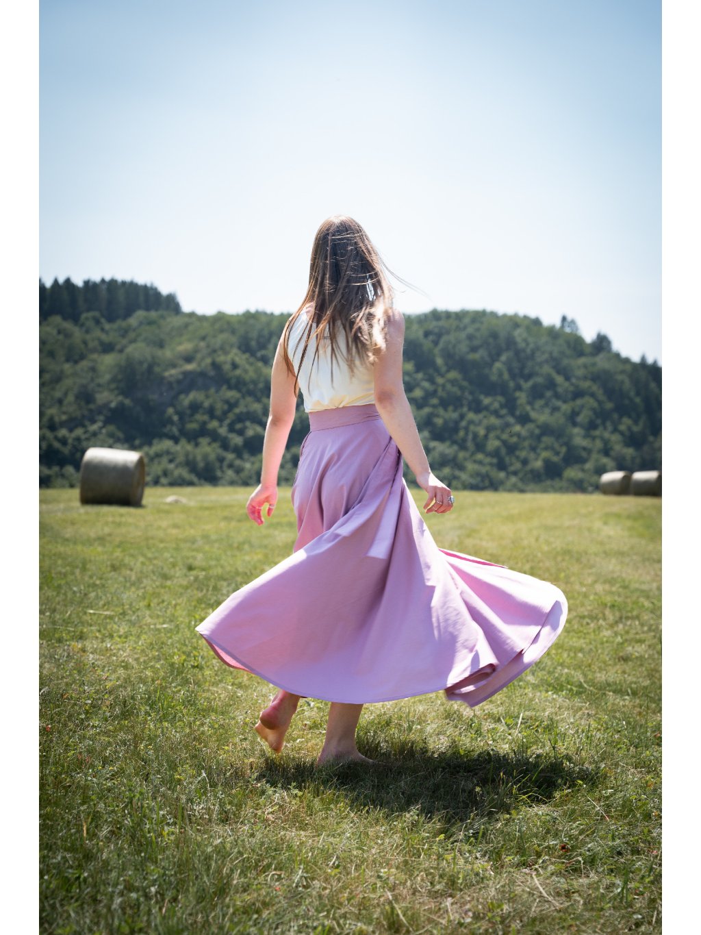 Kolová, zavinovací sukně v něžném odstínu růžového šeříku.