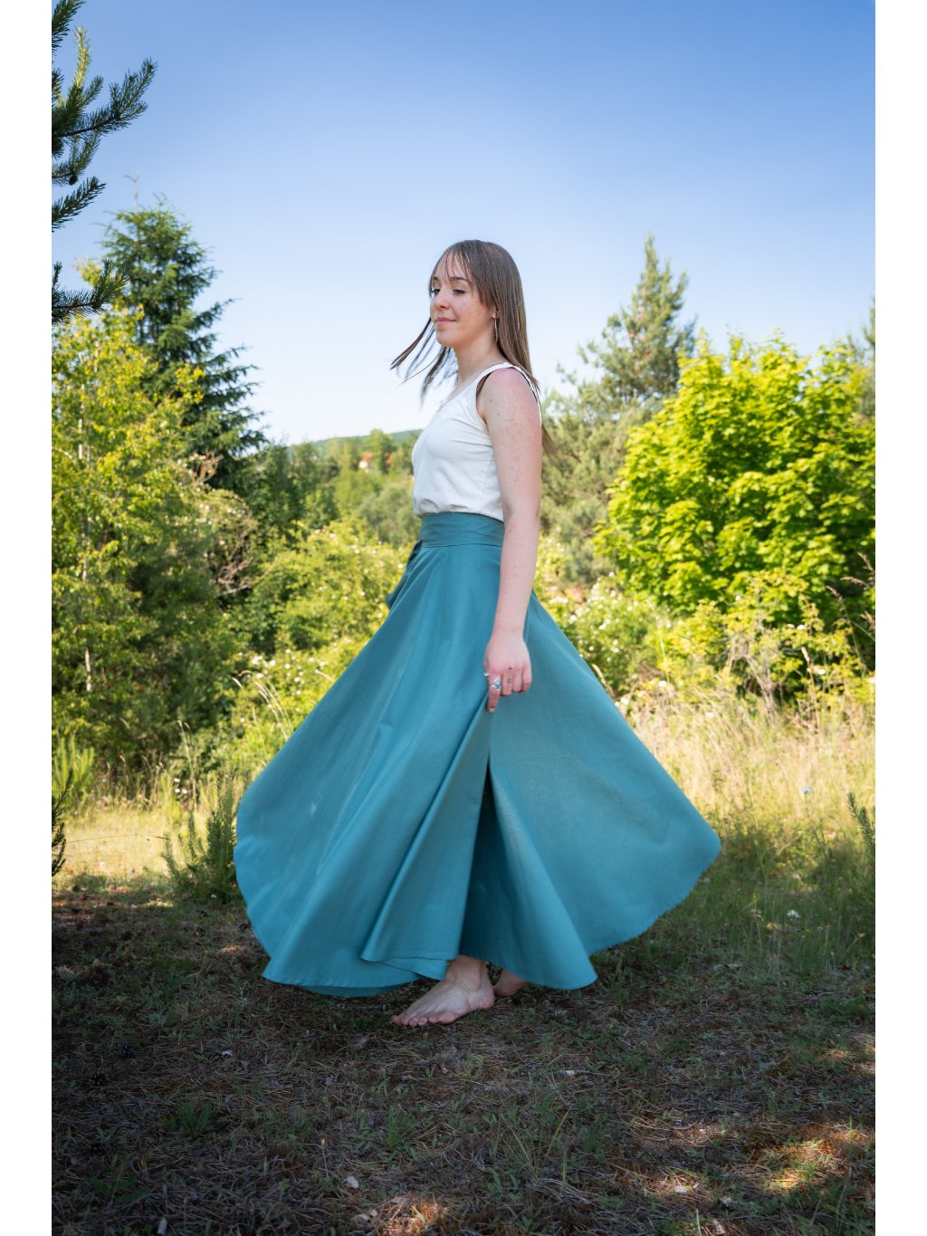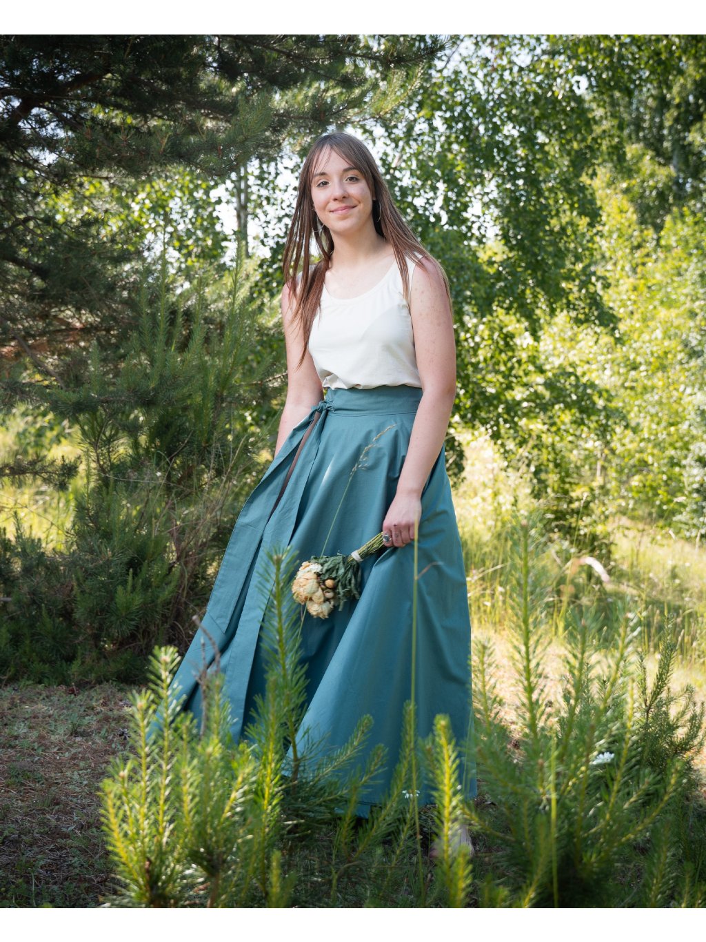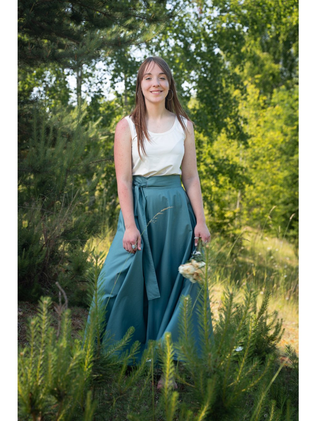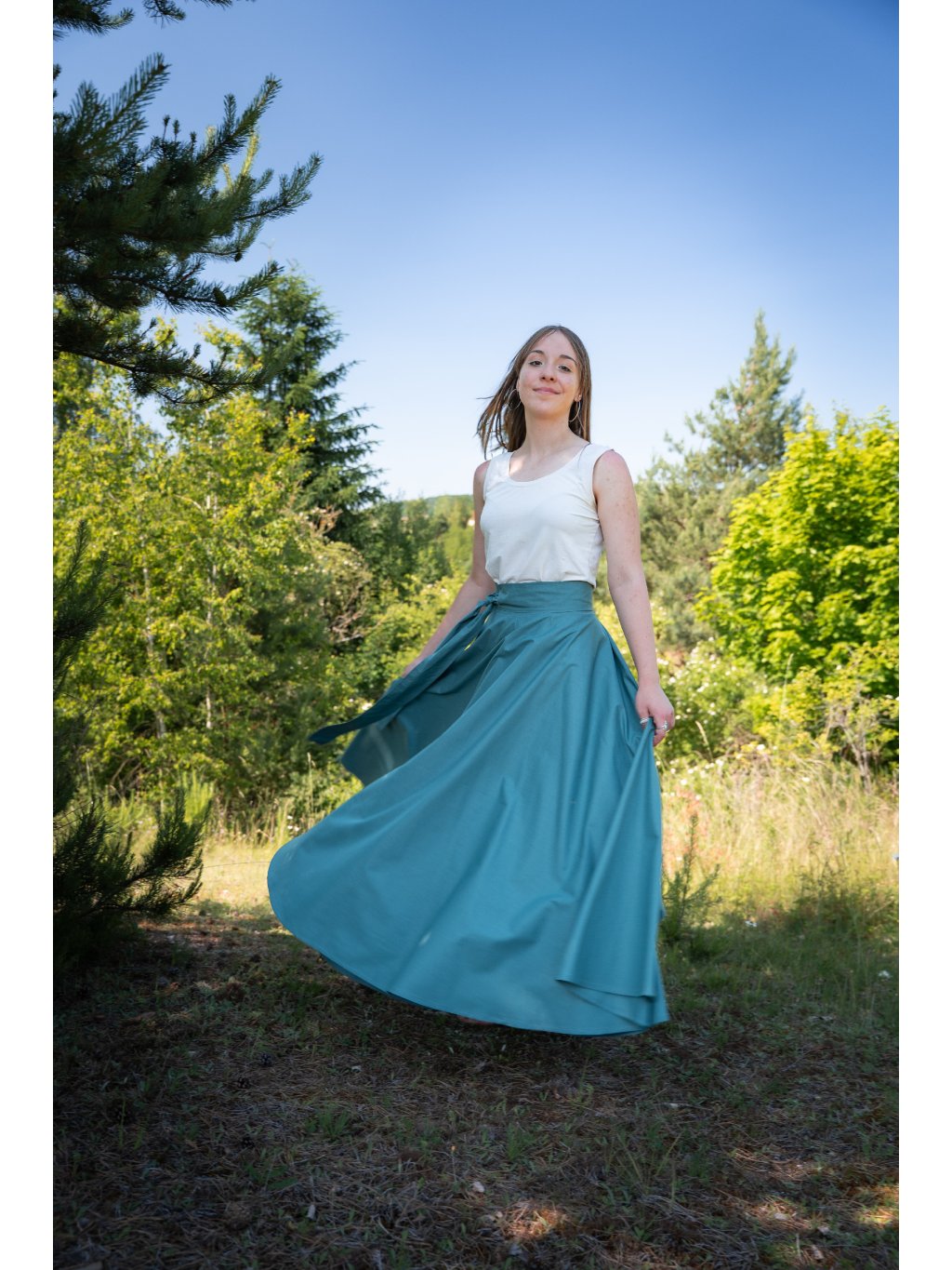 Kolová, zavinovací sukně velmi pěkné barvy, odstín šalvějové zeleně.