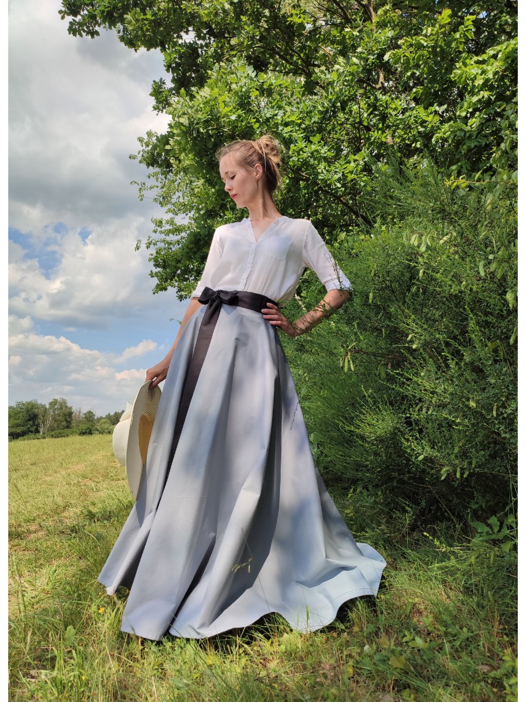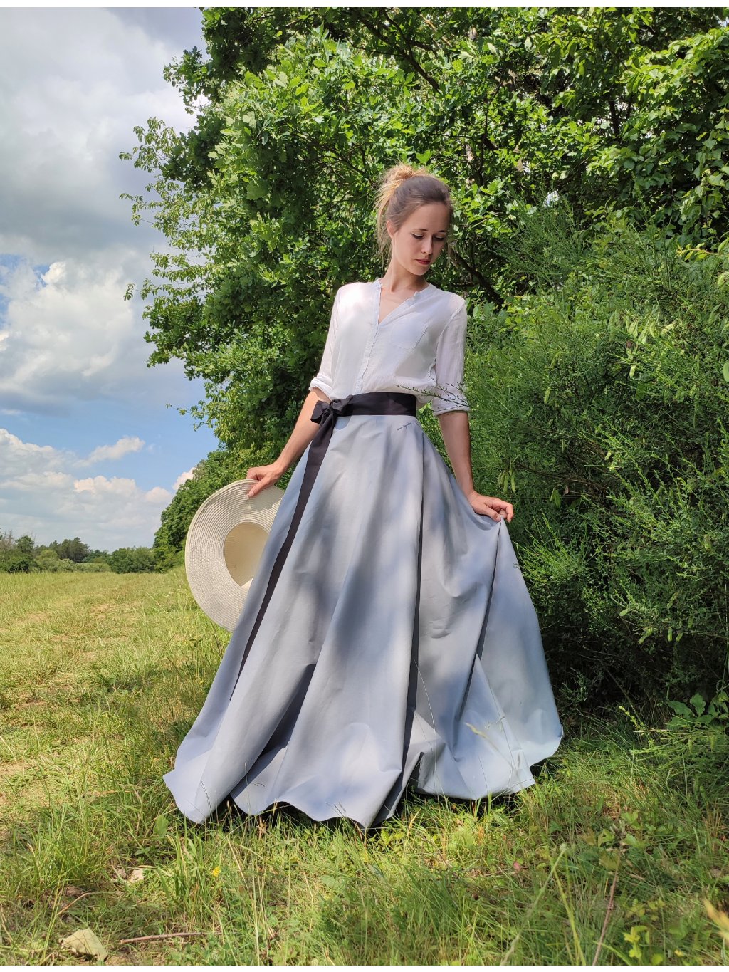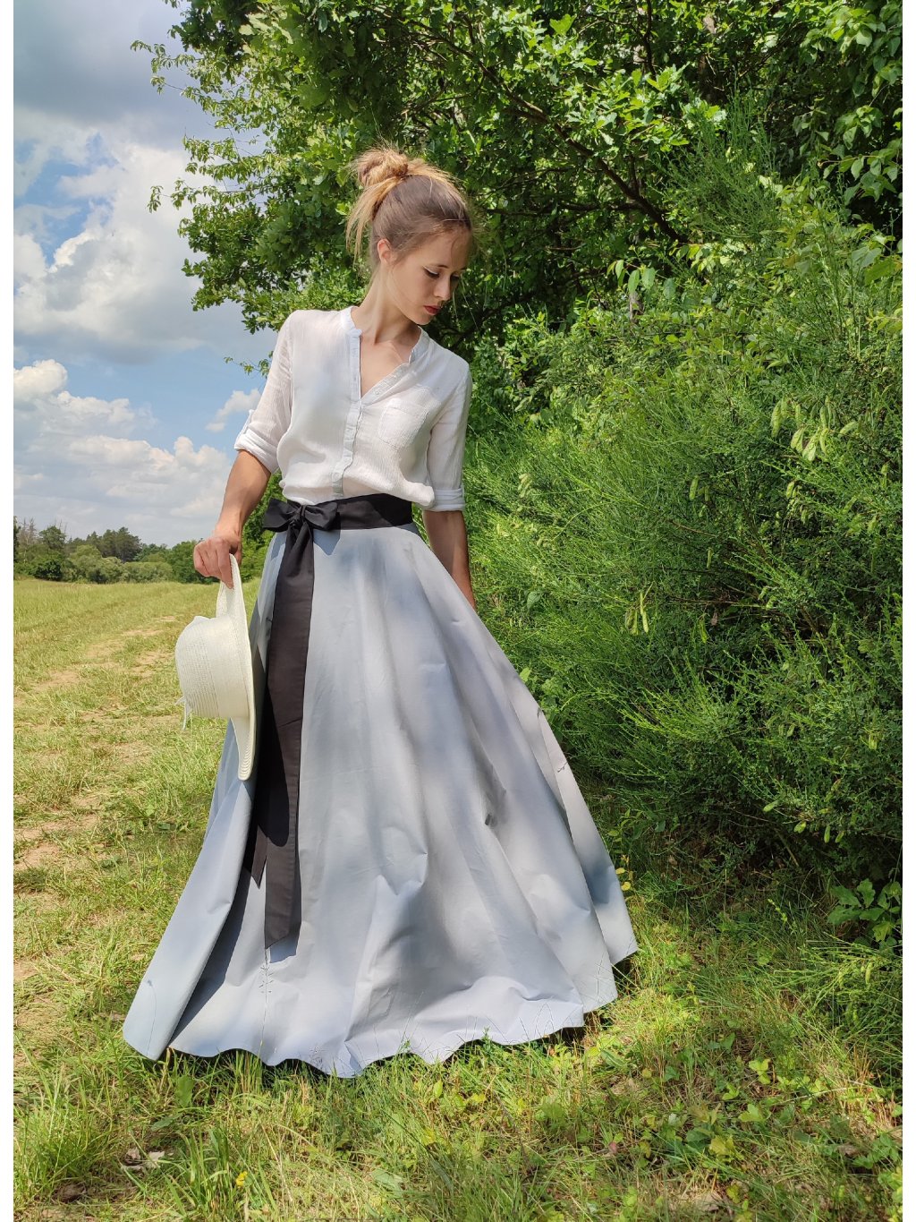 Kolová, zavinovací sukně v šedém odstínu v kontrastu s šedým páskem.
