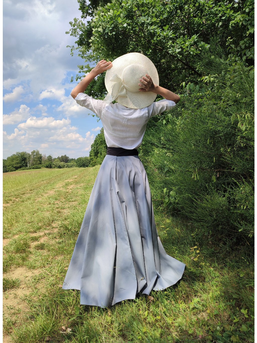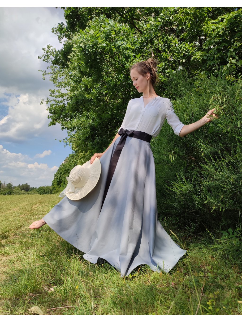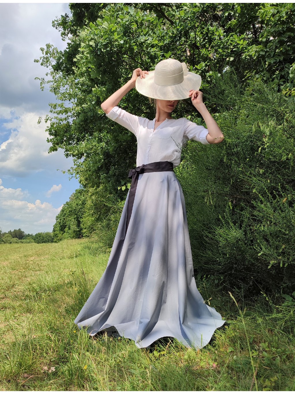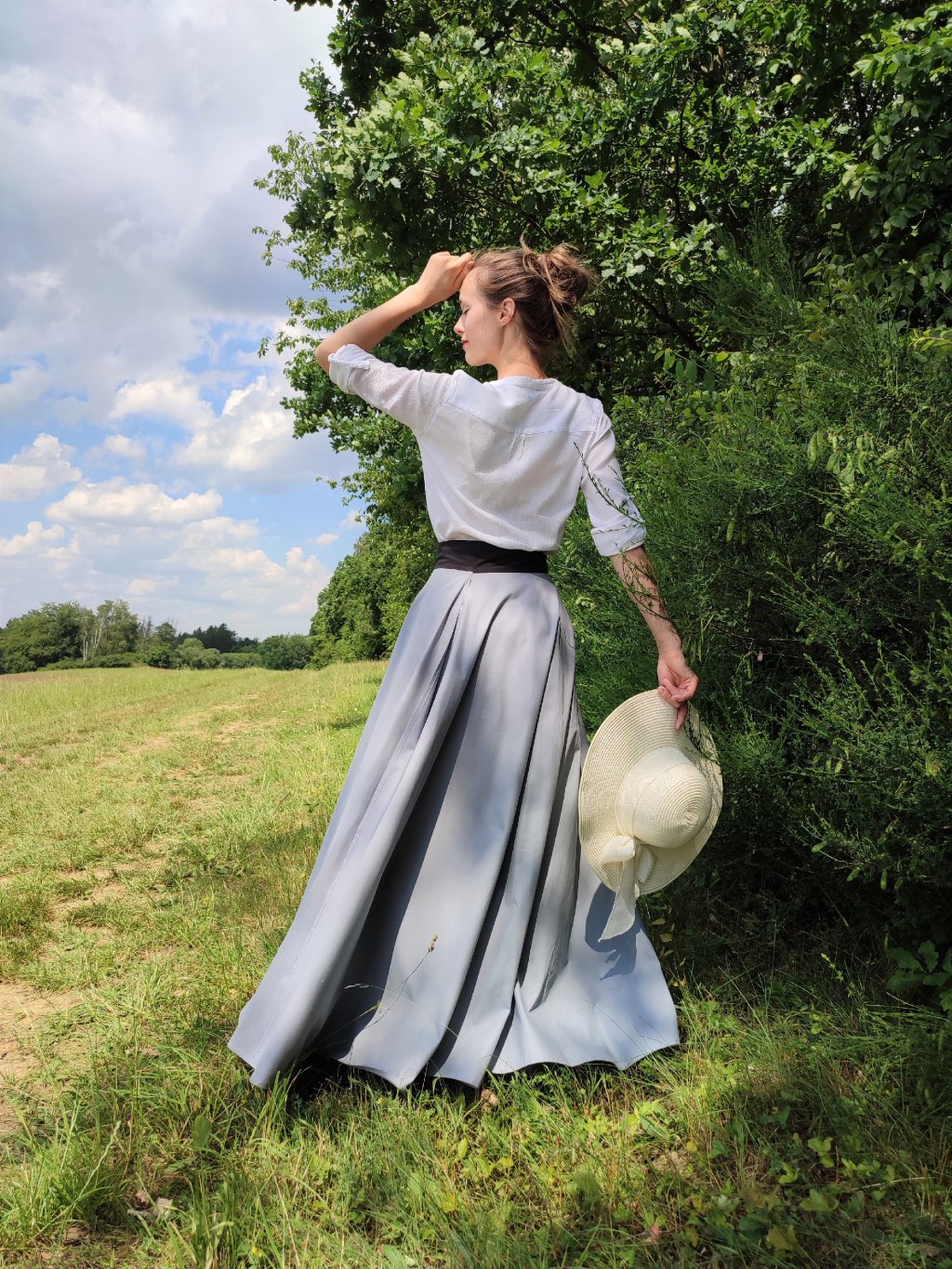 Kolová, zavinovací sukně v šedém odstínu v kontrastu s šedým páskem.