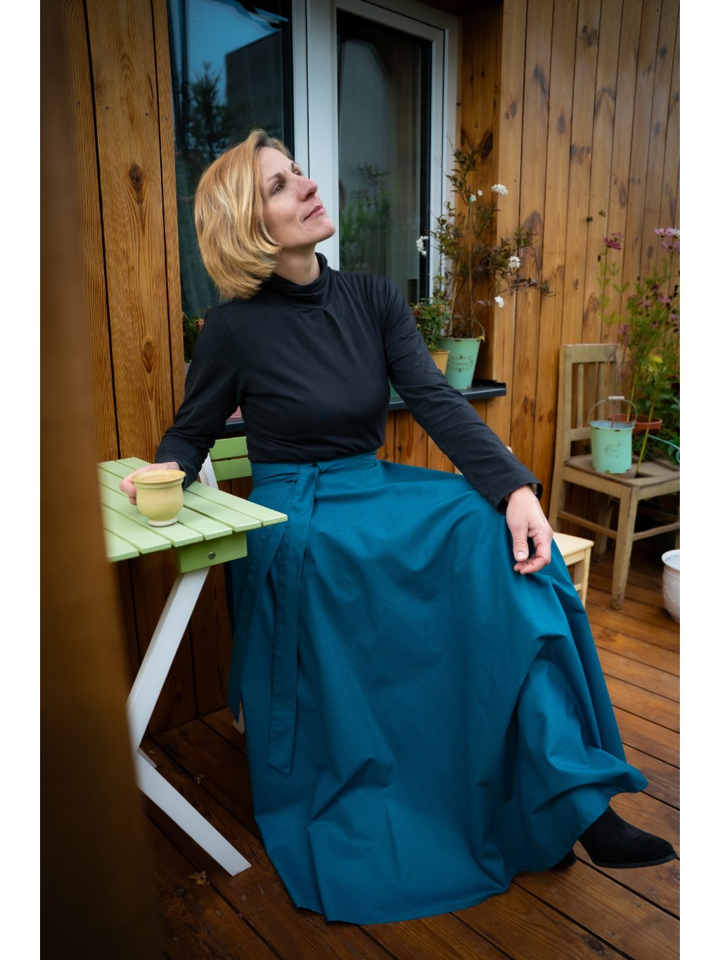 Dlouhá, zavinovací sukně kolového střihu.