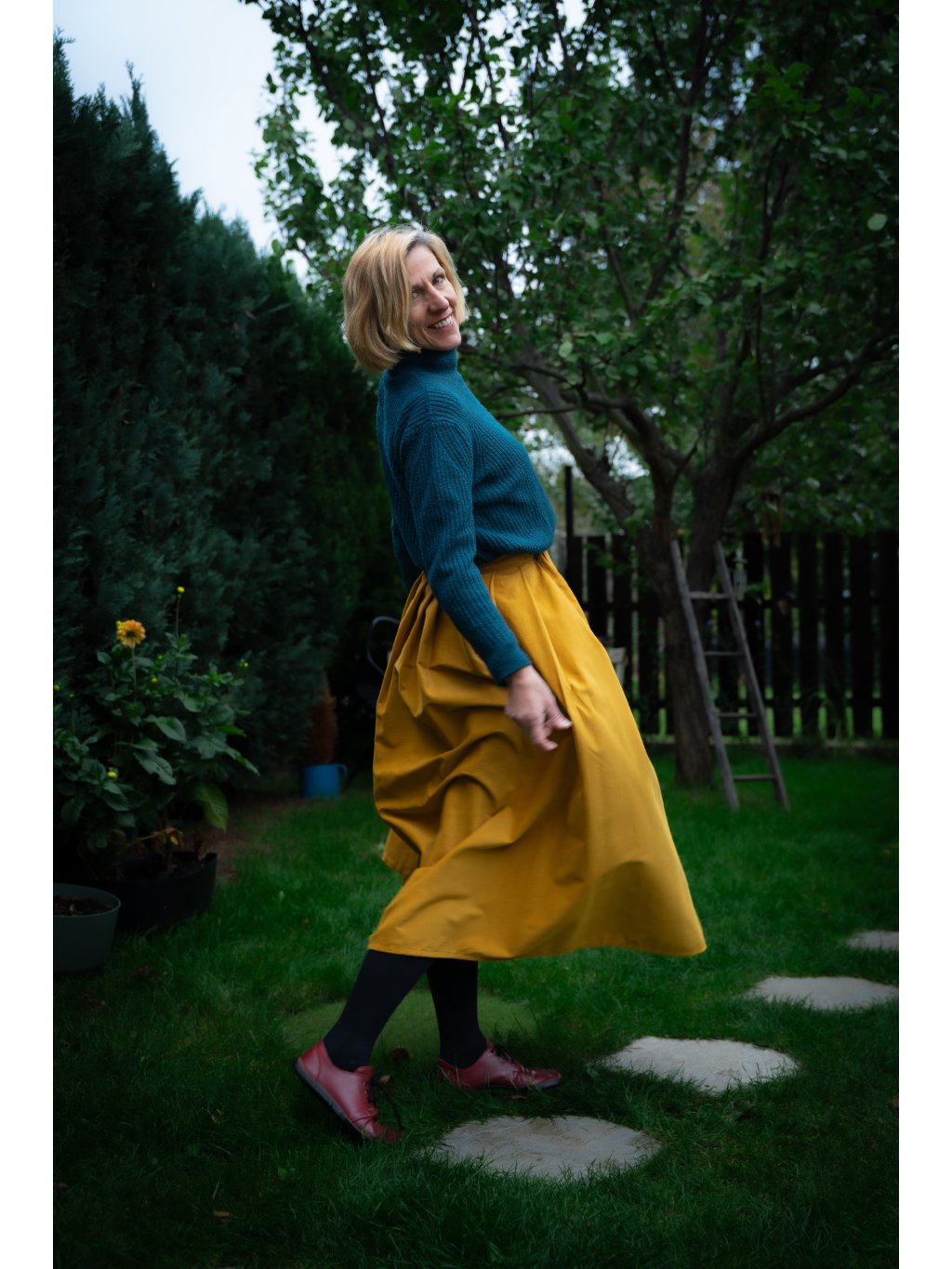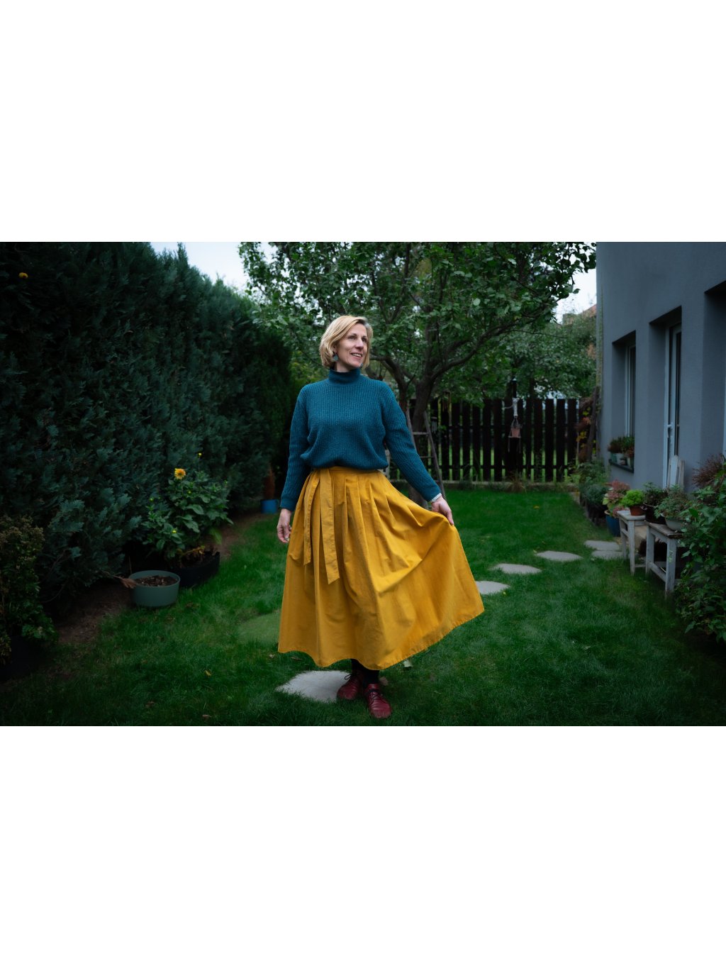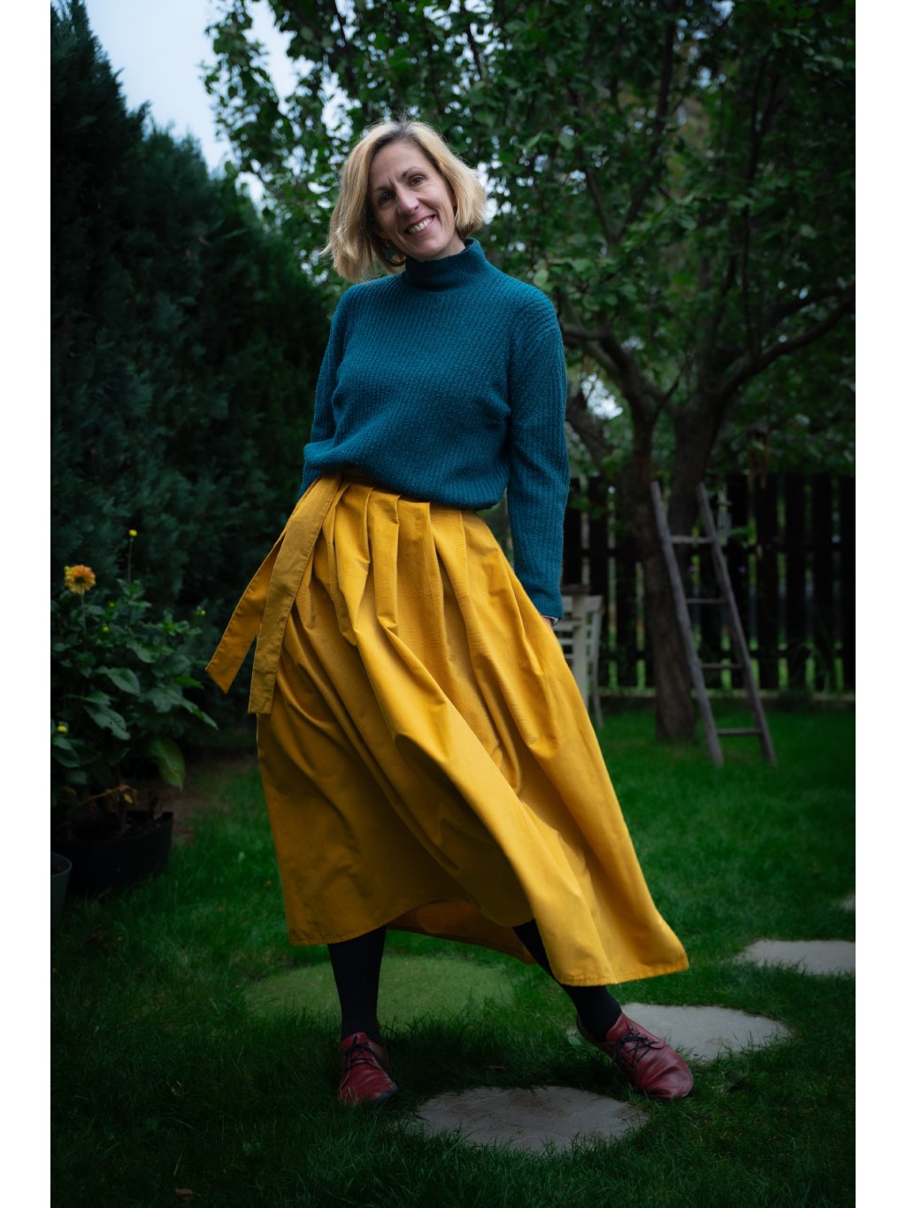 Objevte kouzlo elegance a pohodlí v naší dlouhé manšestrové sukni v hořčicové barvě.