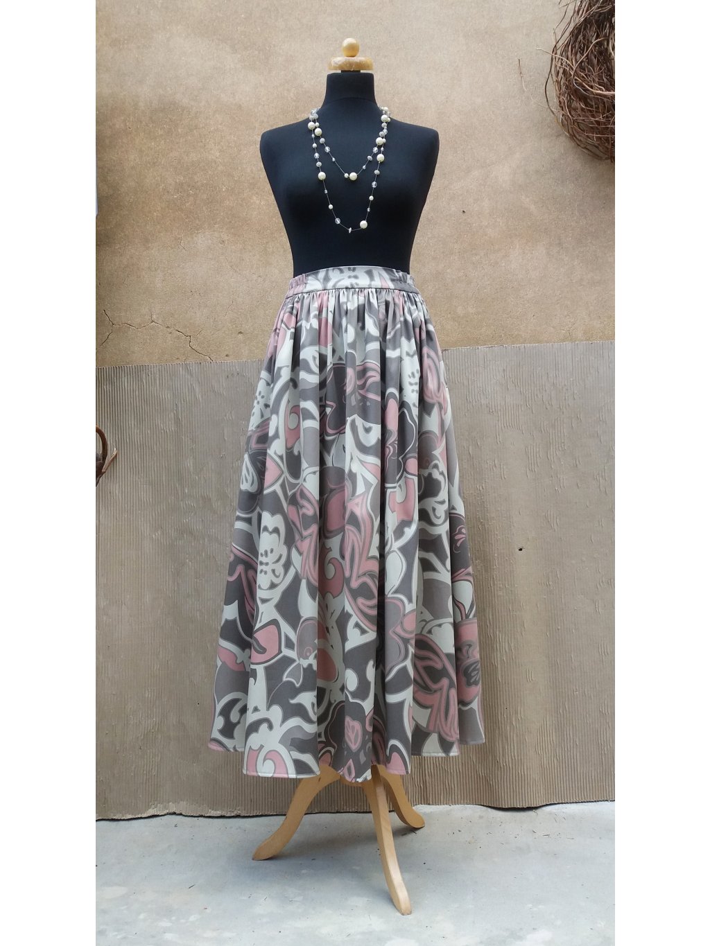 Dlouhá nabíraná sukně - růžové ornamenty