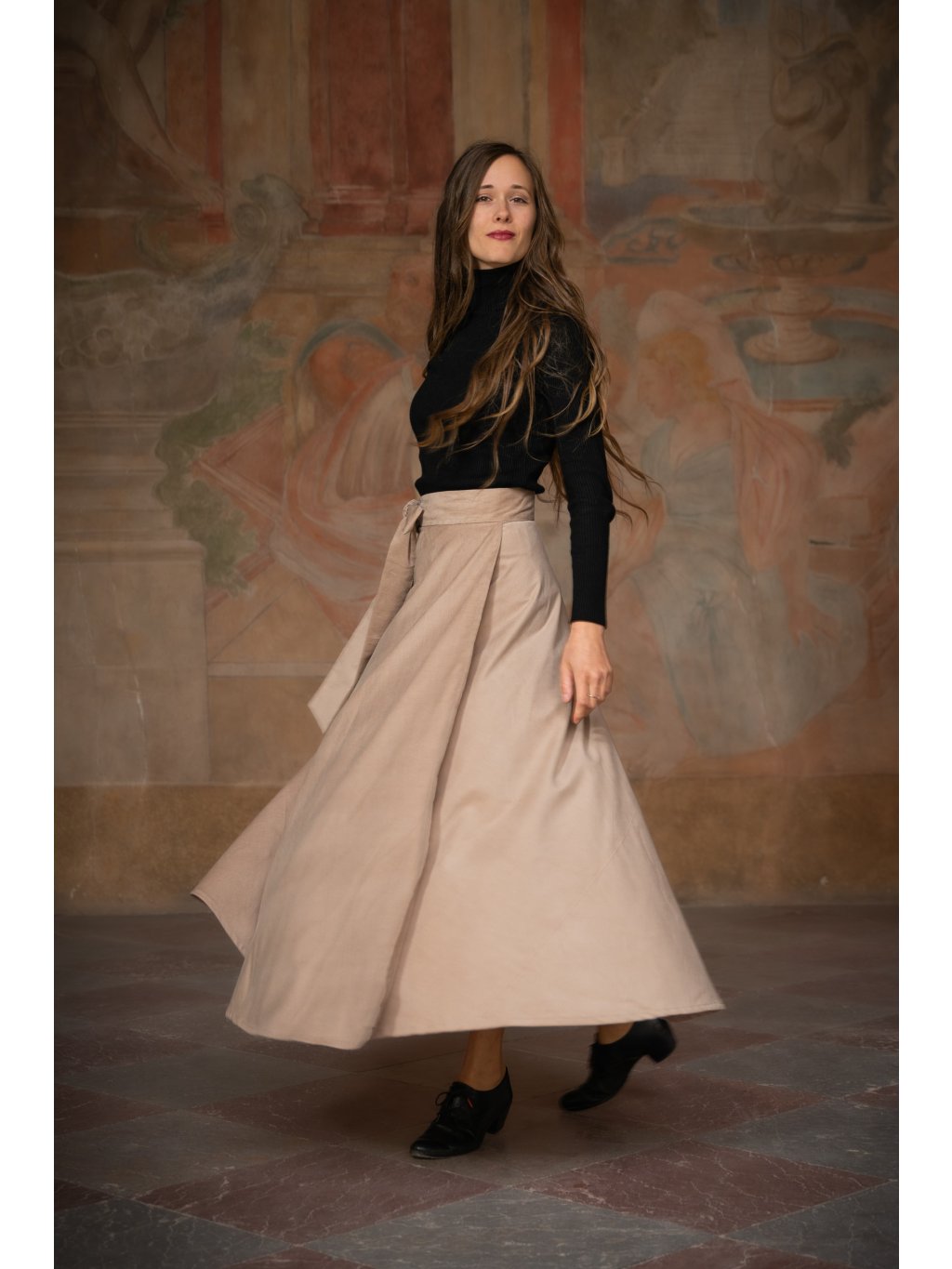 Zavinovací sukně z jemného hebkého manšestru v jemném odstínu bílé kávy dodá vašemu outfitu šmrnc a ženskou eleganci.