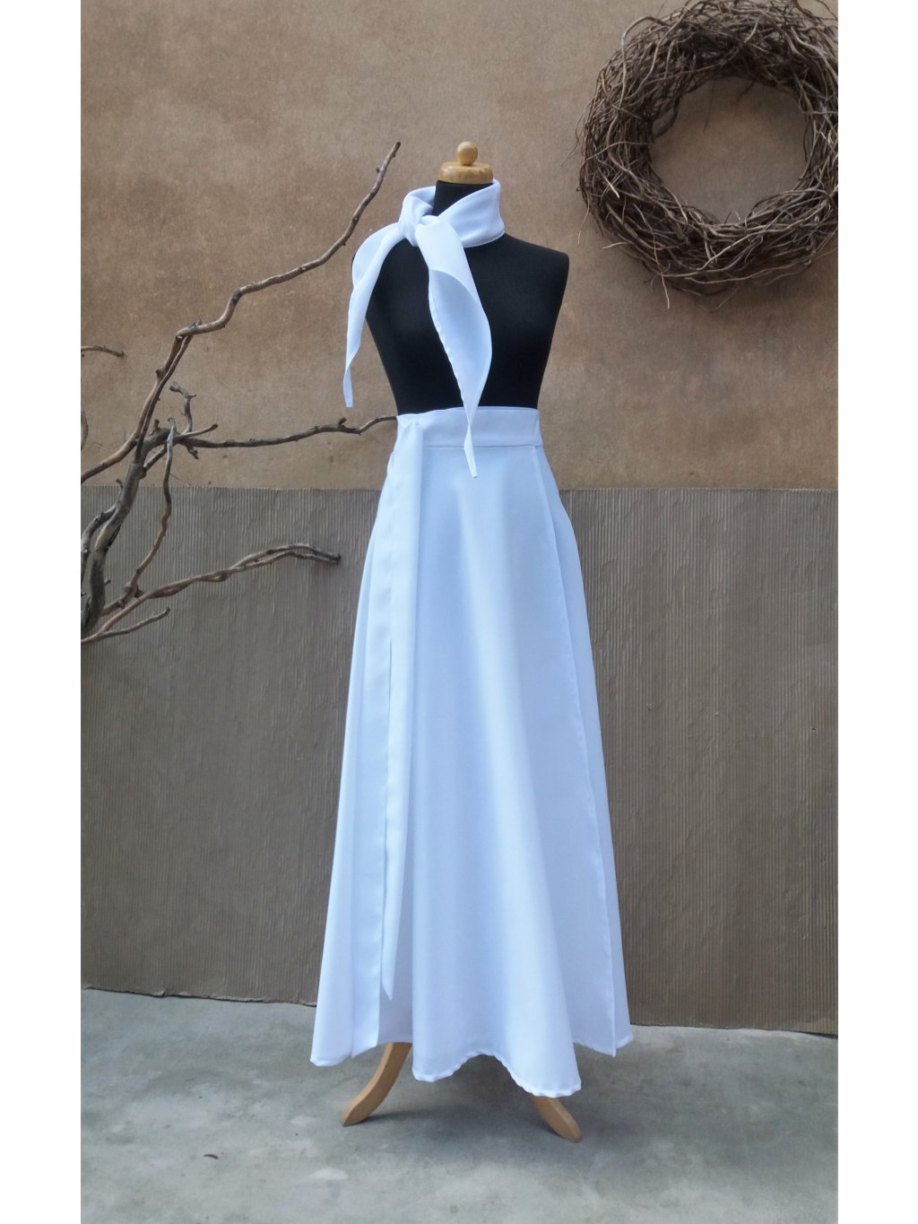 Zavinovací sukně půlkolového střihu v bílé barvě s malým šátečkem.