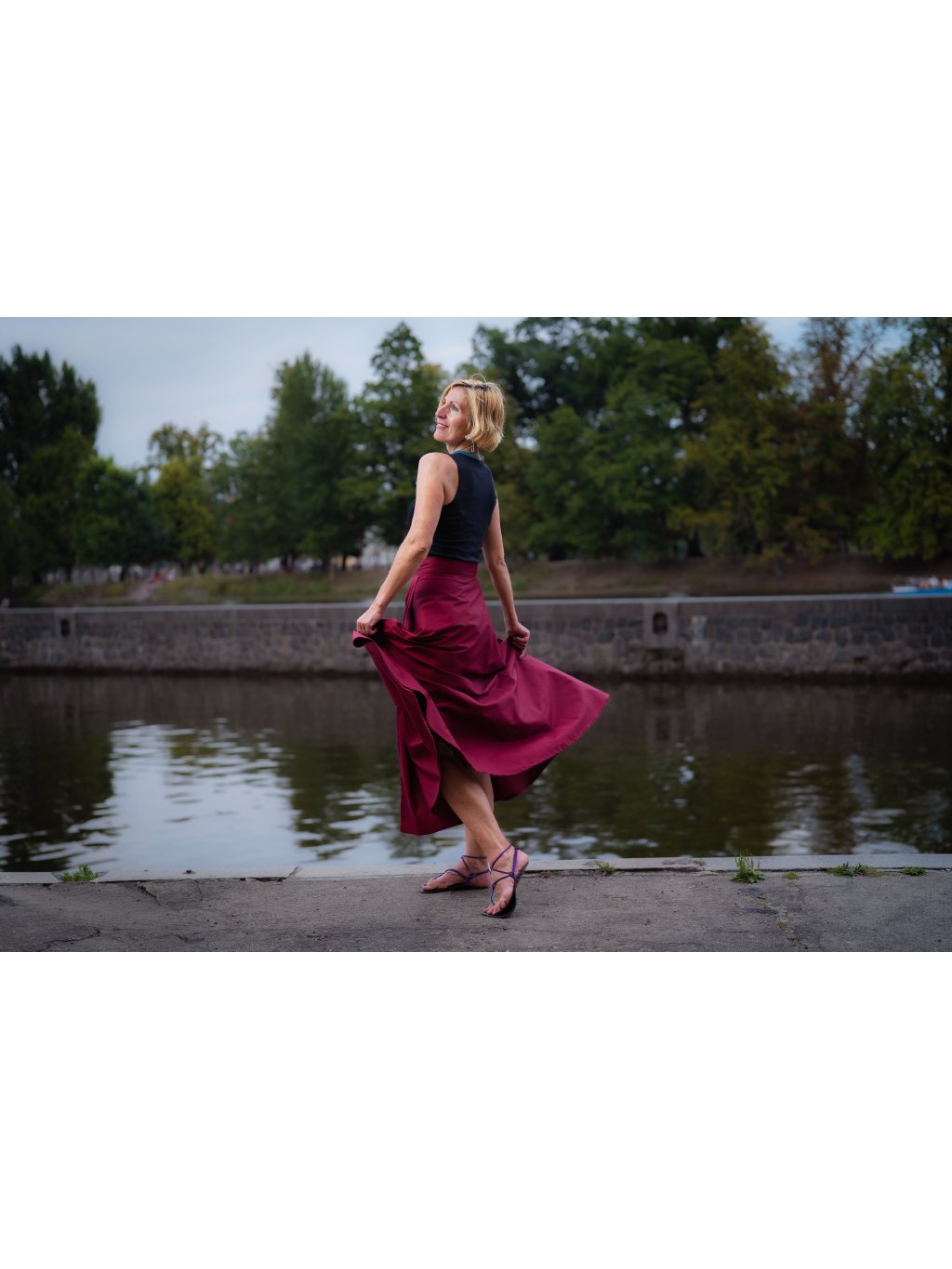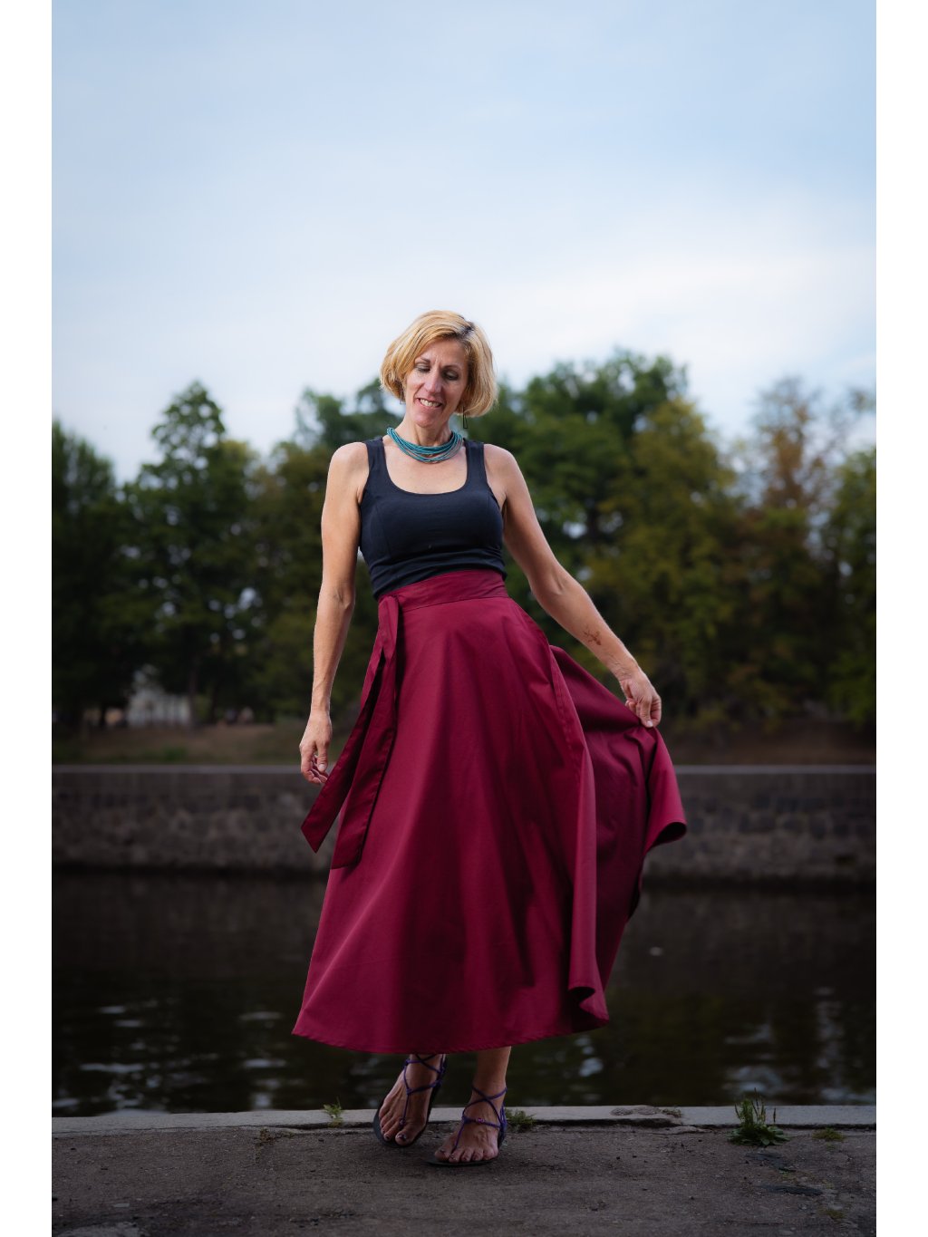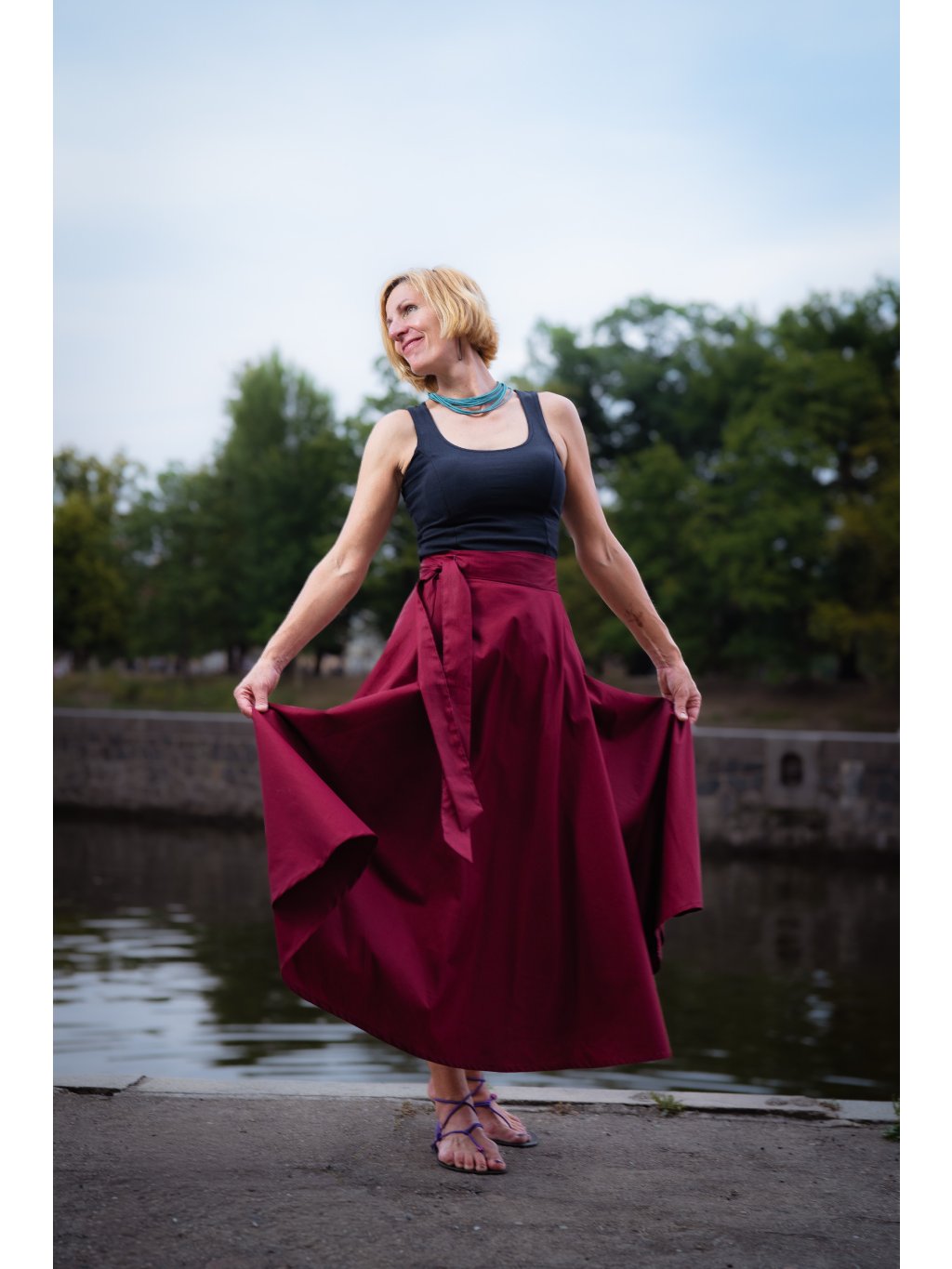 Elegantní, ženská a nadčasová. Tato dlouhá půlkolová sukně z 100 % bavlny v hlubokém odstínu bordó je ideální pro ženy, které milují originální handmade módu.