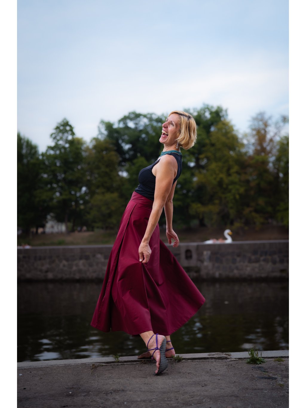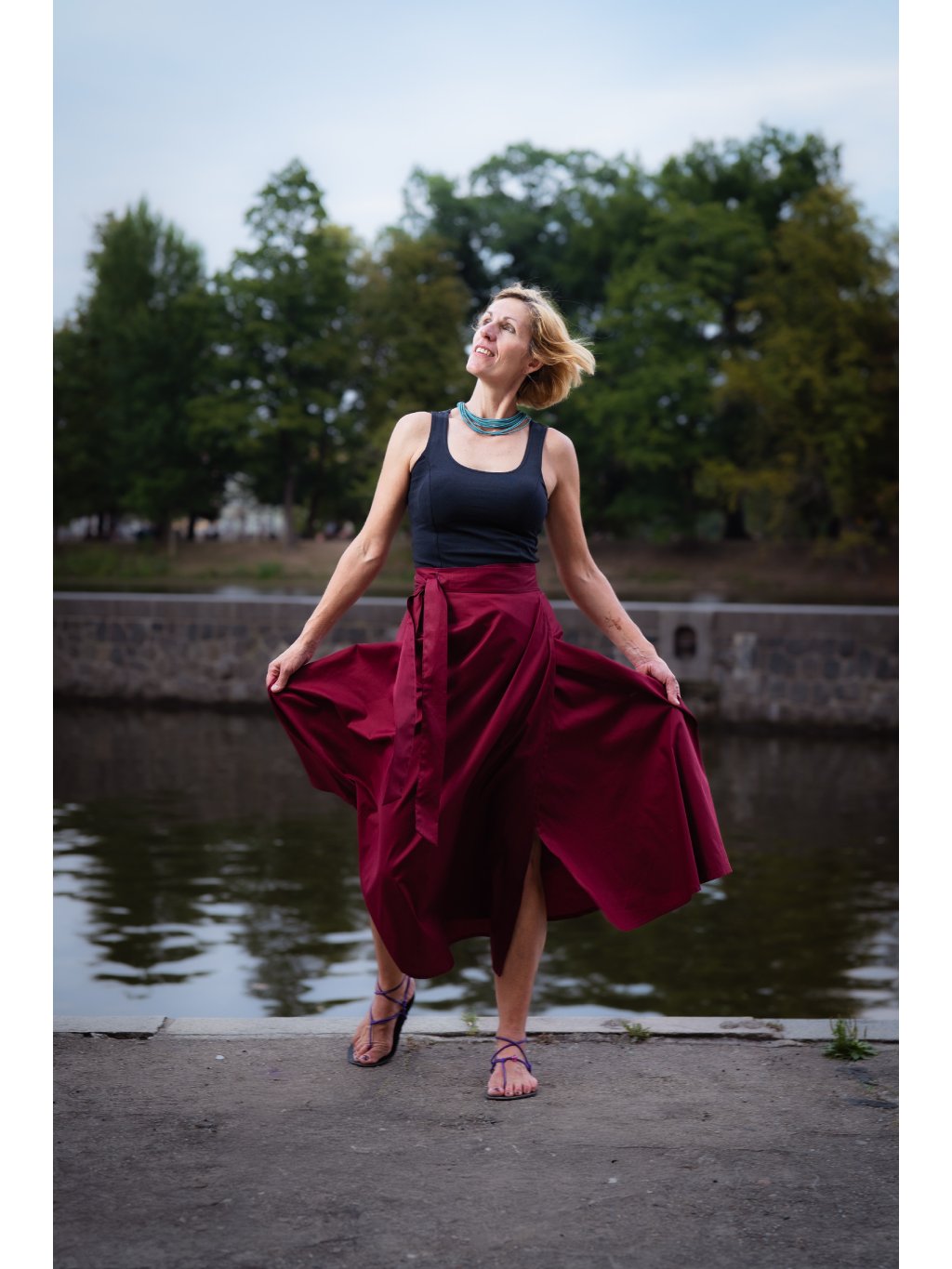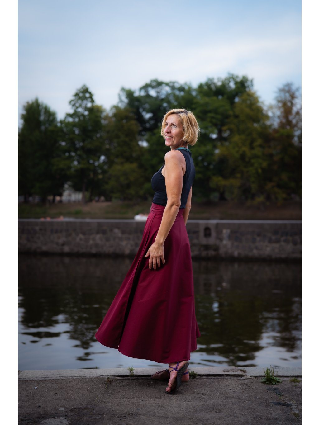 Elegantní, ženská a nadčasová. Tato dlouhá půlkolová sukně z 100 % bavlny v hlubokém odstínu bordó je ideální pro ženy, které milují originální handmade módu.