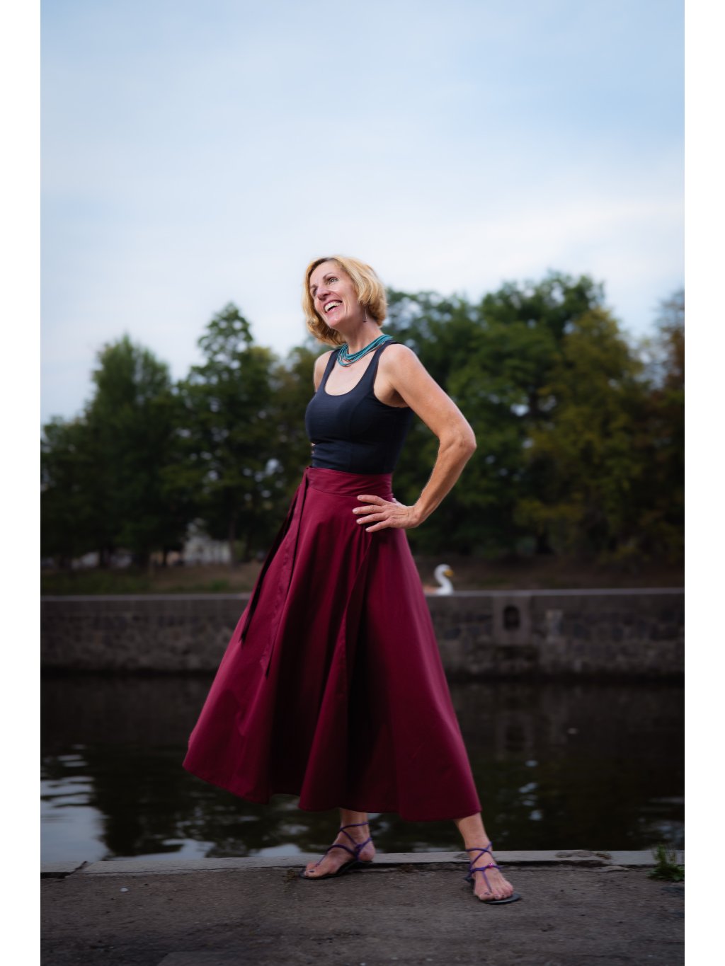 Zavinovací střih krásně sedí v pase a půlkolový tvar dodává sukni ladný pohyb i přirozenou eleganci. Skvěle se hodí do divadla, do práce i na běžné dny, kdy chcete působit upraveně, stylově a cítit se pohodlně.
