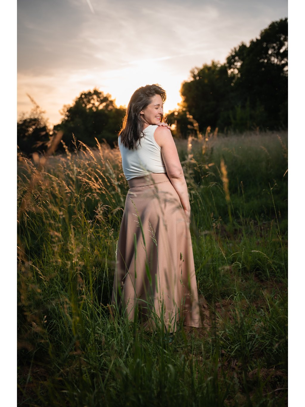 Zavinovací sukně půlkolového střihu v béžové barvě.
