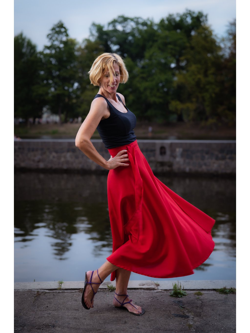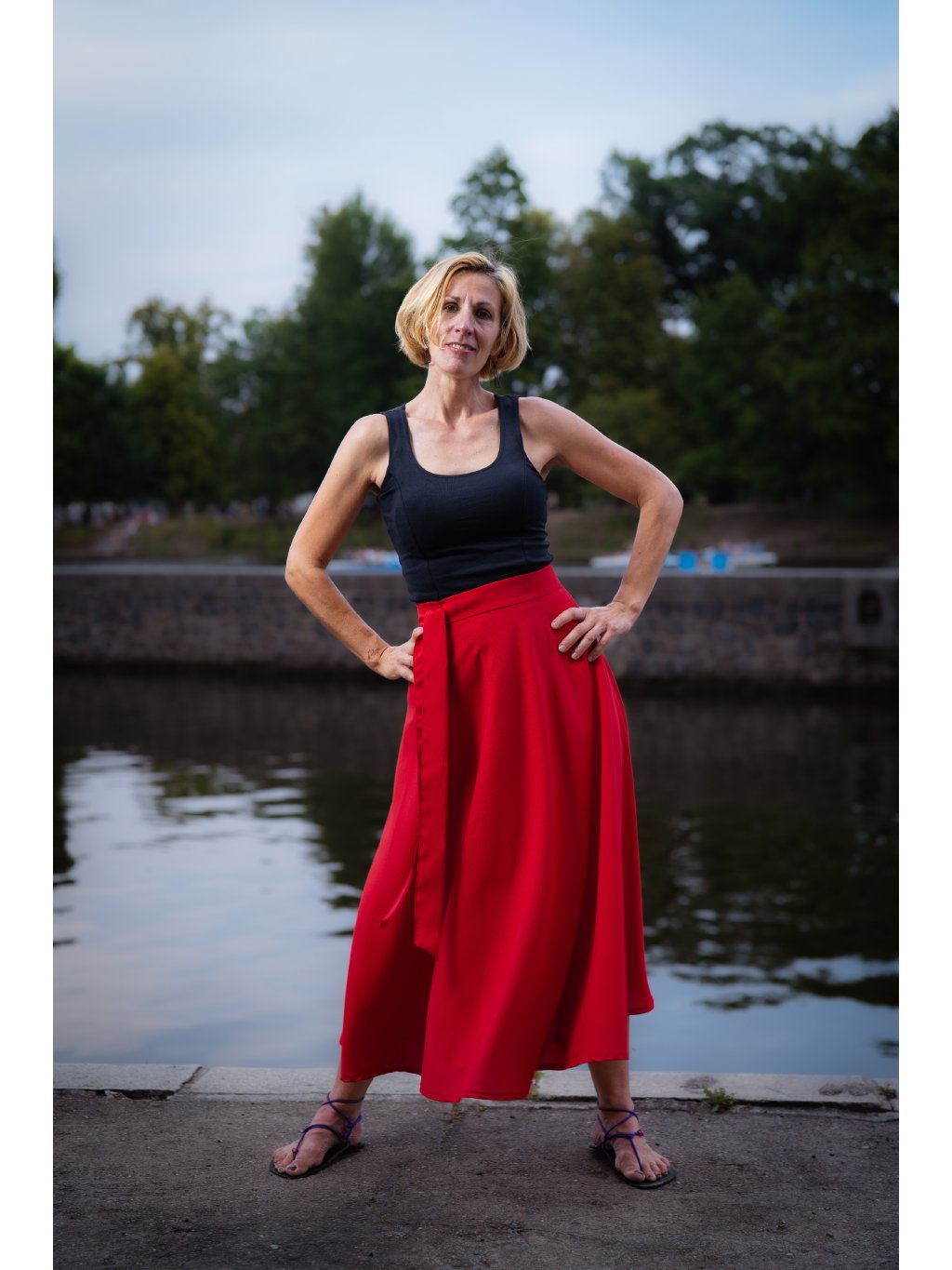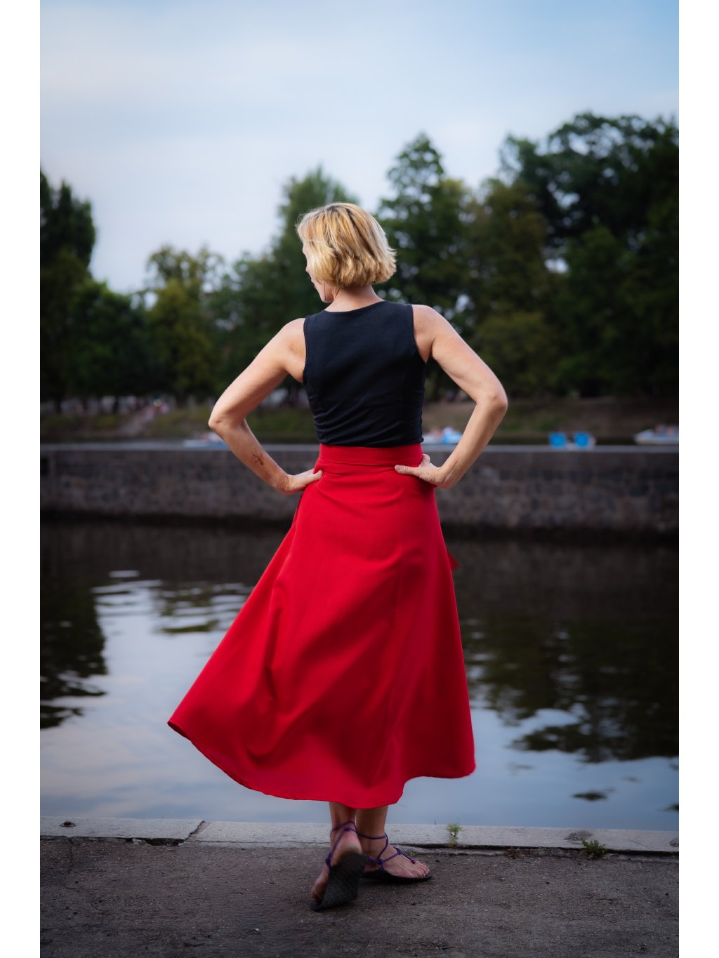 Zavinovací sukně půlkolového střihu v červené barvě.