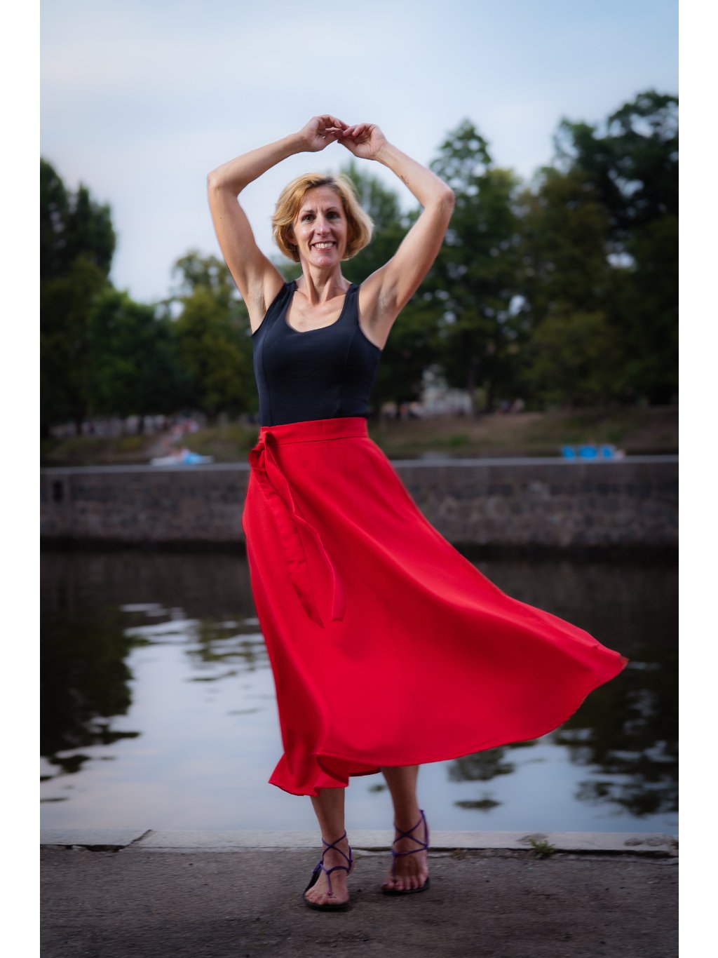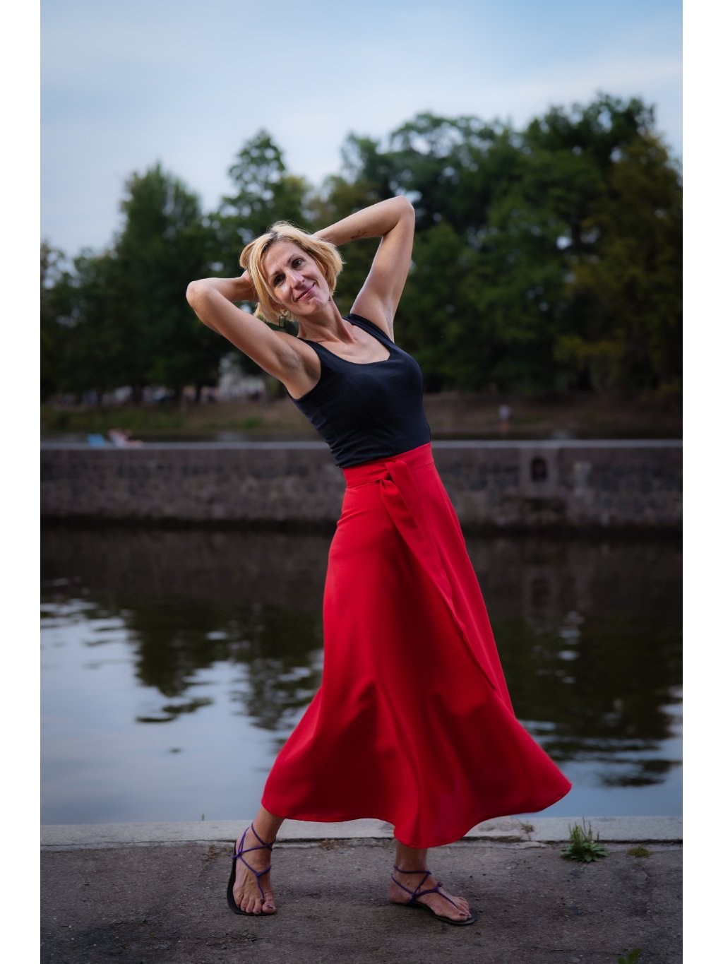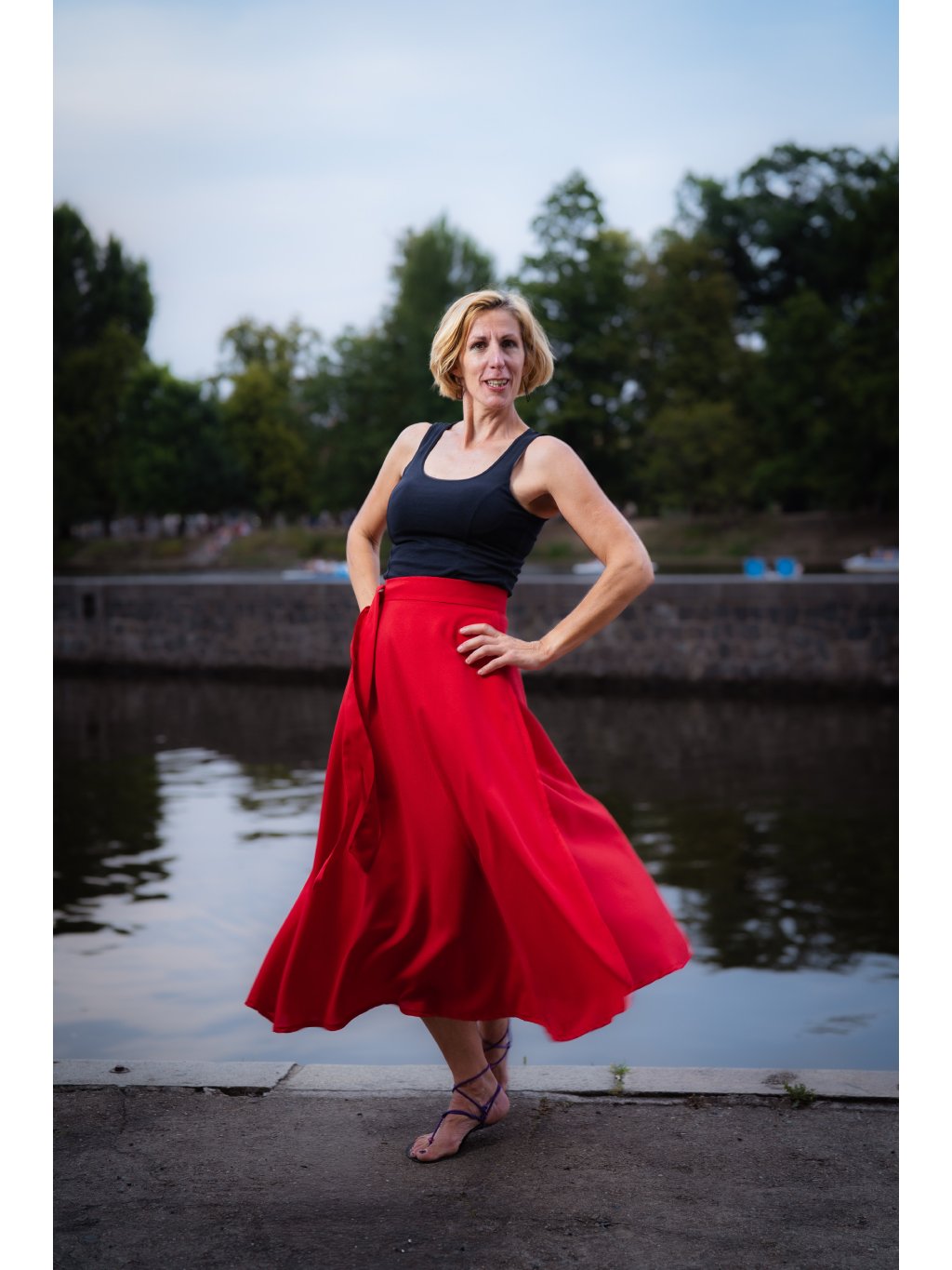 Zavinovací sukně půlkolového střihu v červené barvě.