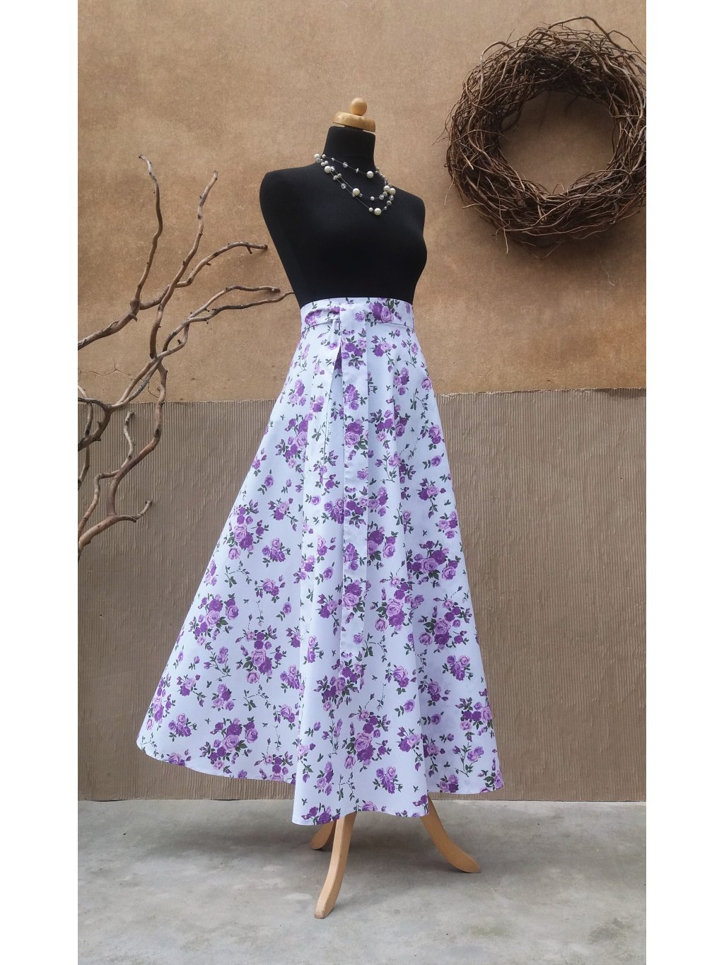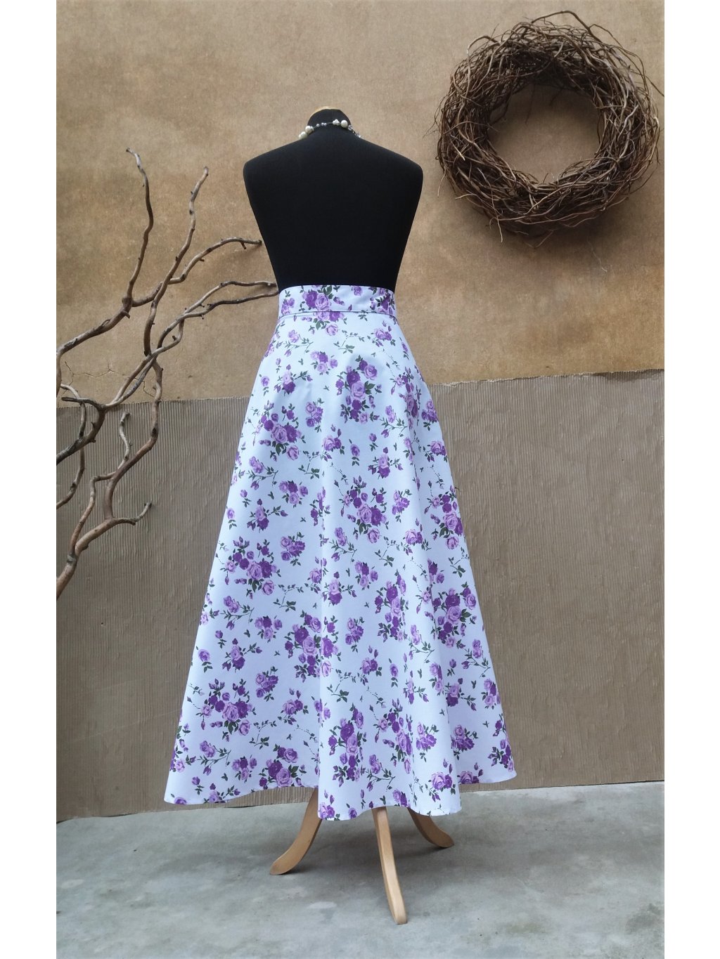 Dlouhá půlkolová sukně - fialová kvítka