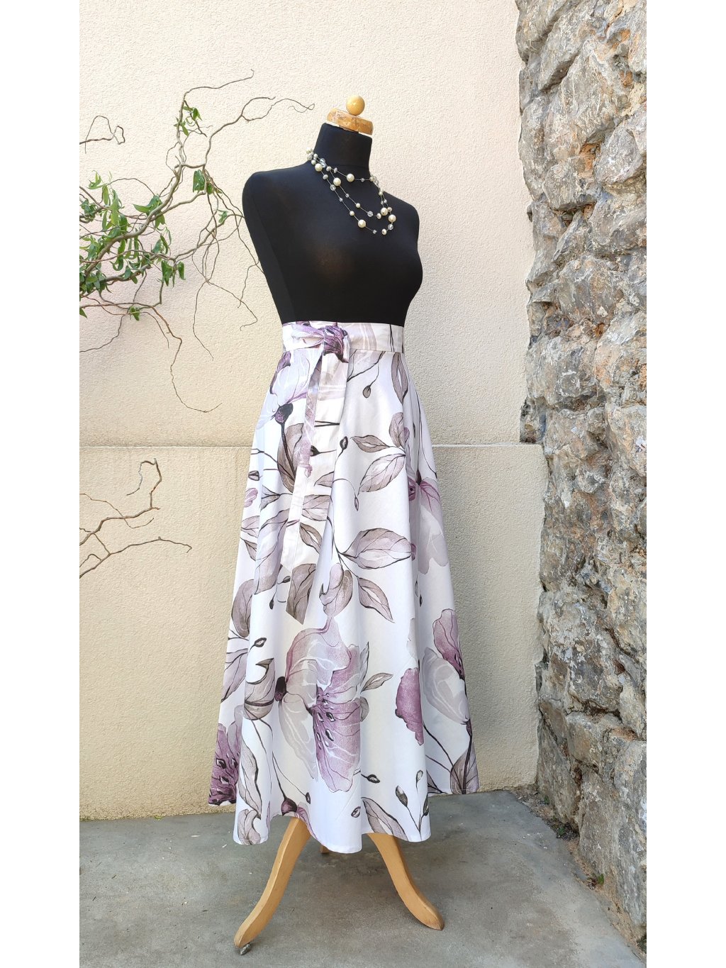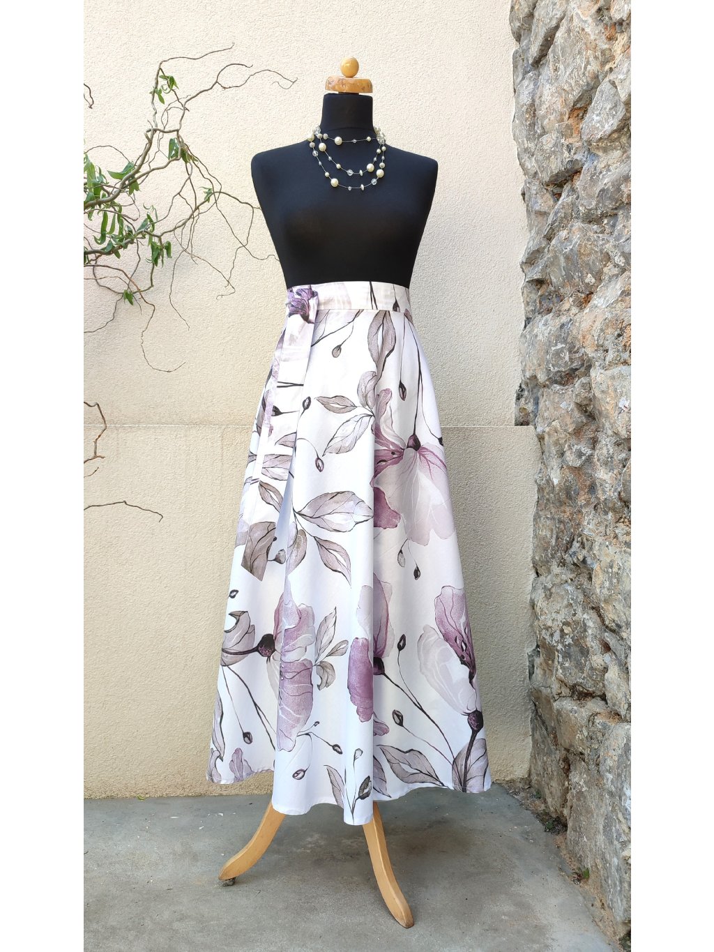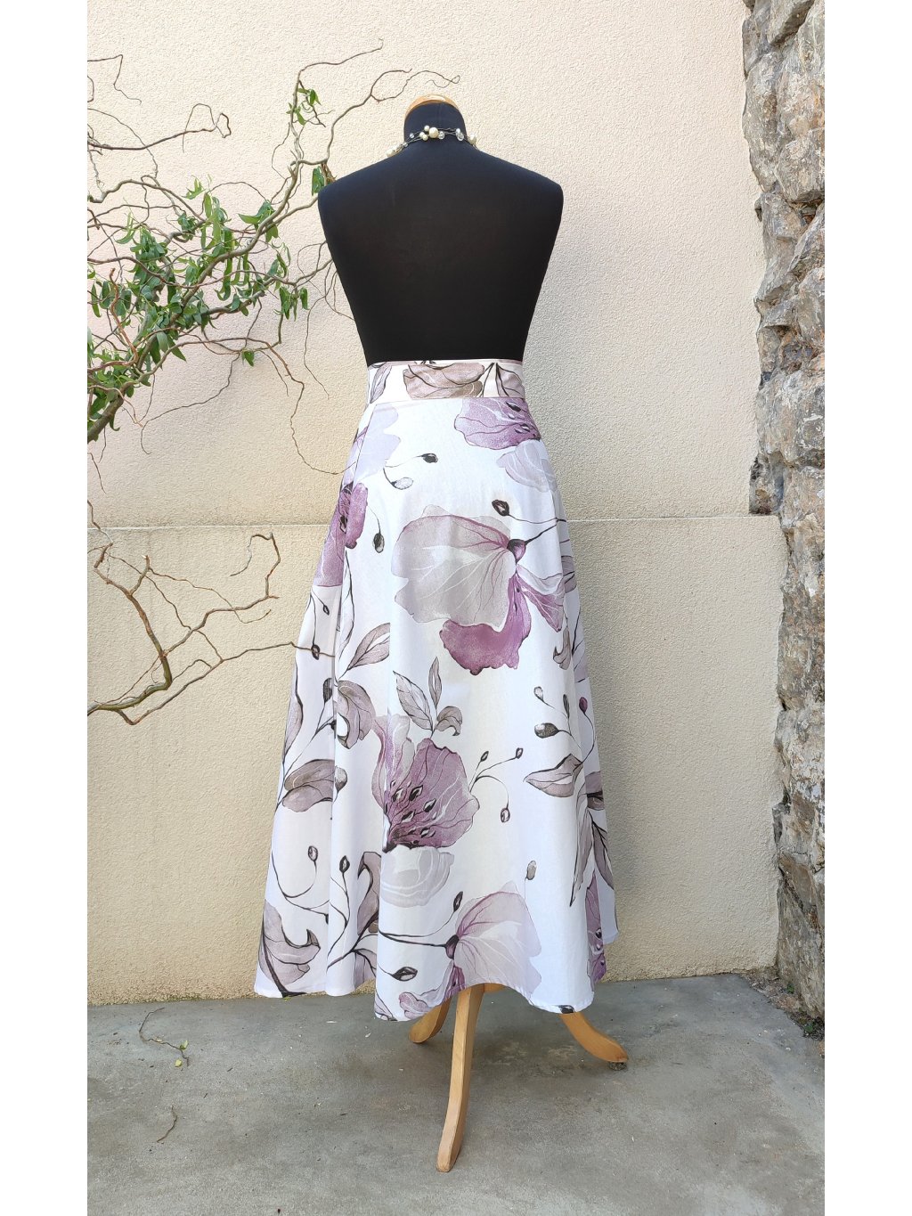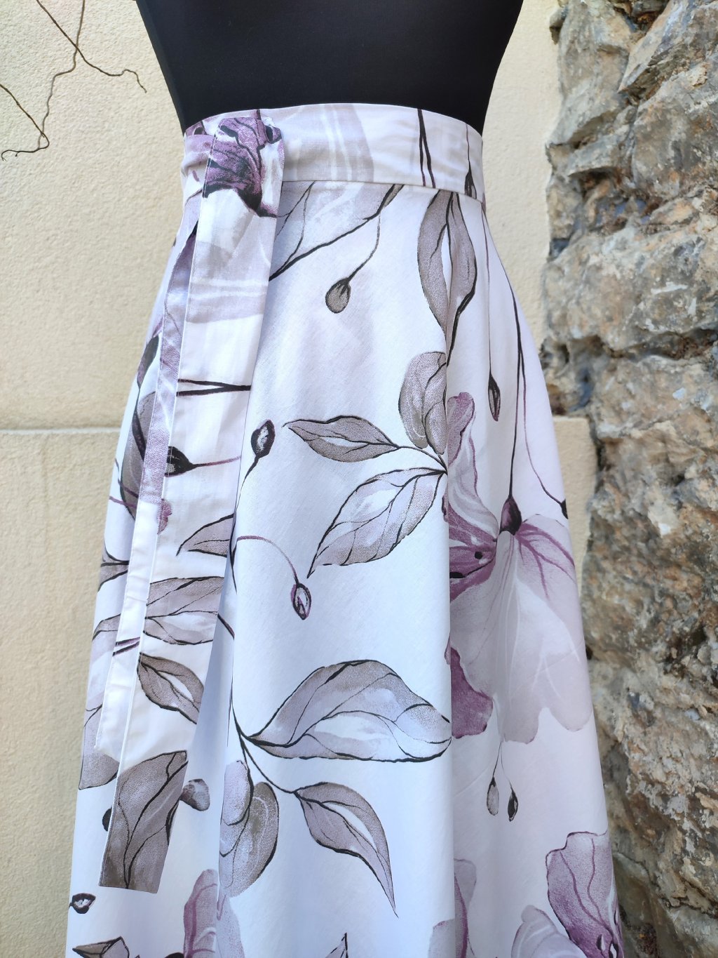Zavinovací sukně půlkolového střihu, 100% bavlna s jemným vzorem akvarelových květů.