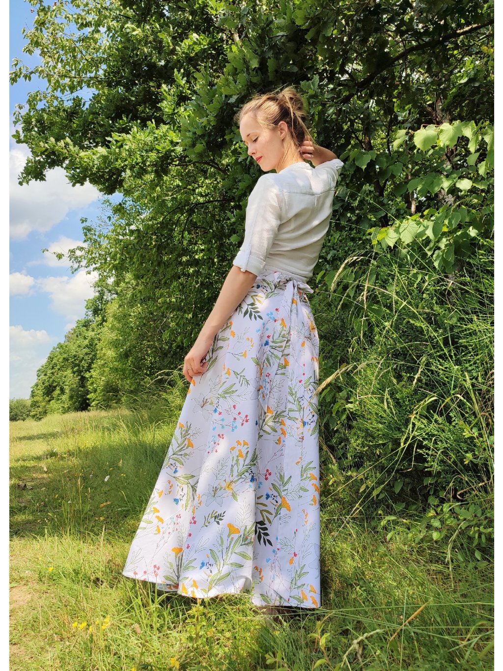 Veselá, zavinovací sukně půlkolového střihu.