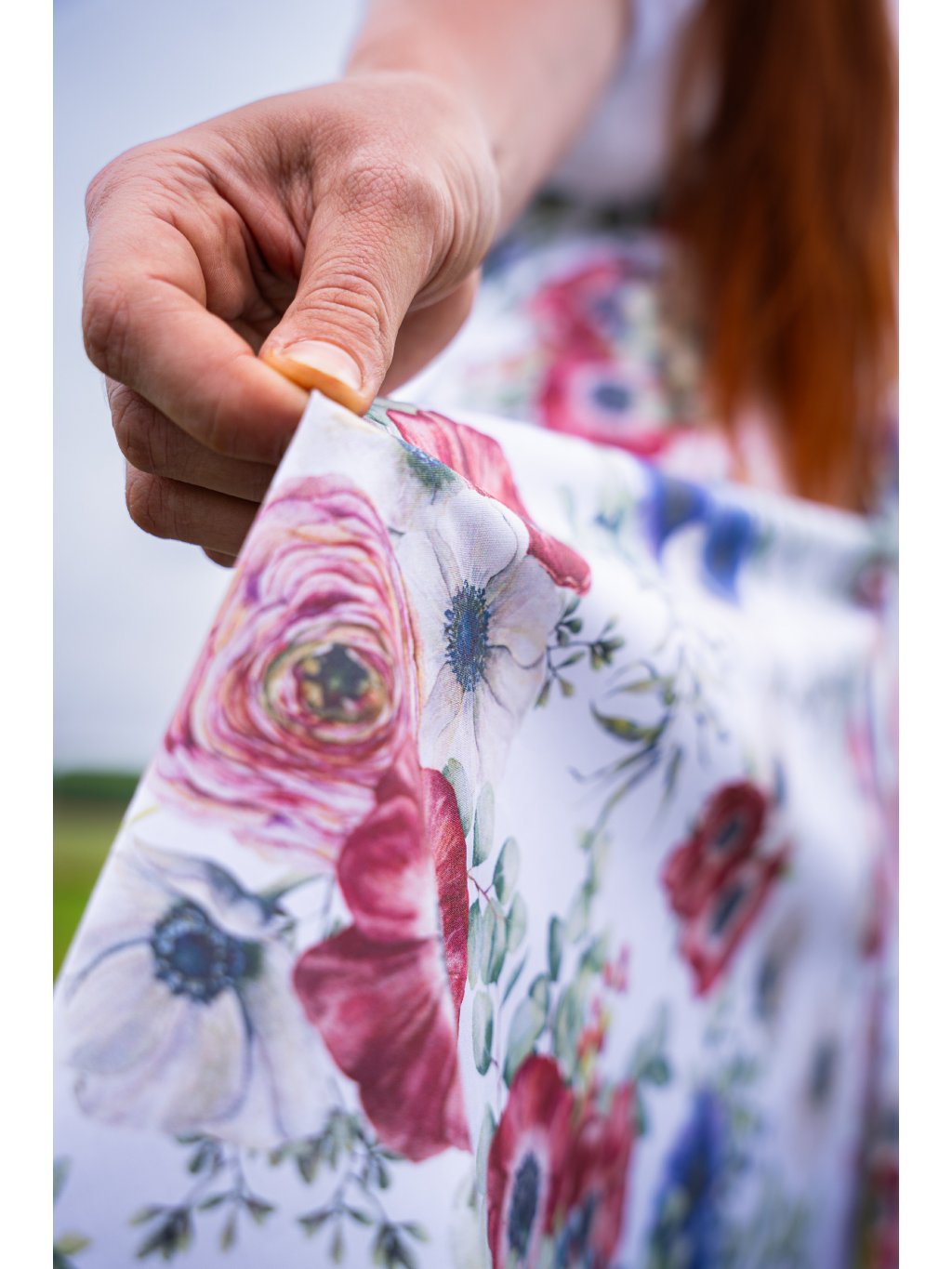 Jemná a velmi kvalitní bavlna, bílý podklad s tiskem jemných kvítků, digitální tisk.